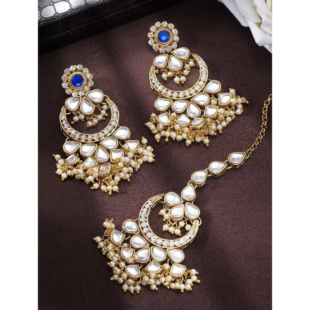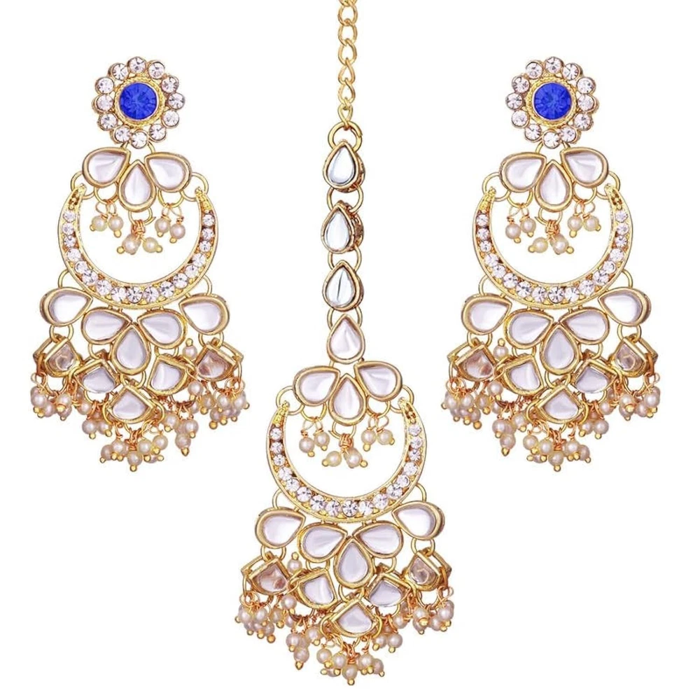 Aheli Kundan Pearl Chandbali Earrings with Maang Tikka Indian Traditional Bollywood Fashion Jewelry Set Gift for Women Product Details Color: Blue Brand: Aheli MPN: AH-PF24ET4153 UPC: Does not apply EAN: Does not apply Item model number : AH-PF24ET4153 Department : womens Date First Available : November 20, 2020 Brand, Seller, or Collection Name: Aheli Metal stamp: Not stamped Metal: Brass Material: Metal Item Length: 4.72 inches Clasp: Lobster Clasp Ring size: adjustable