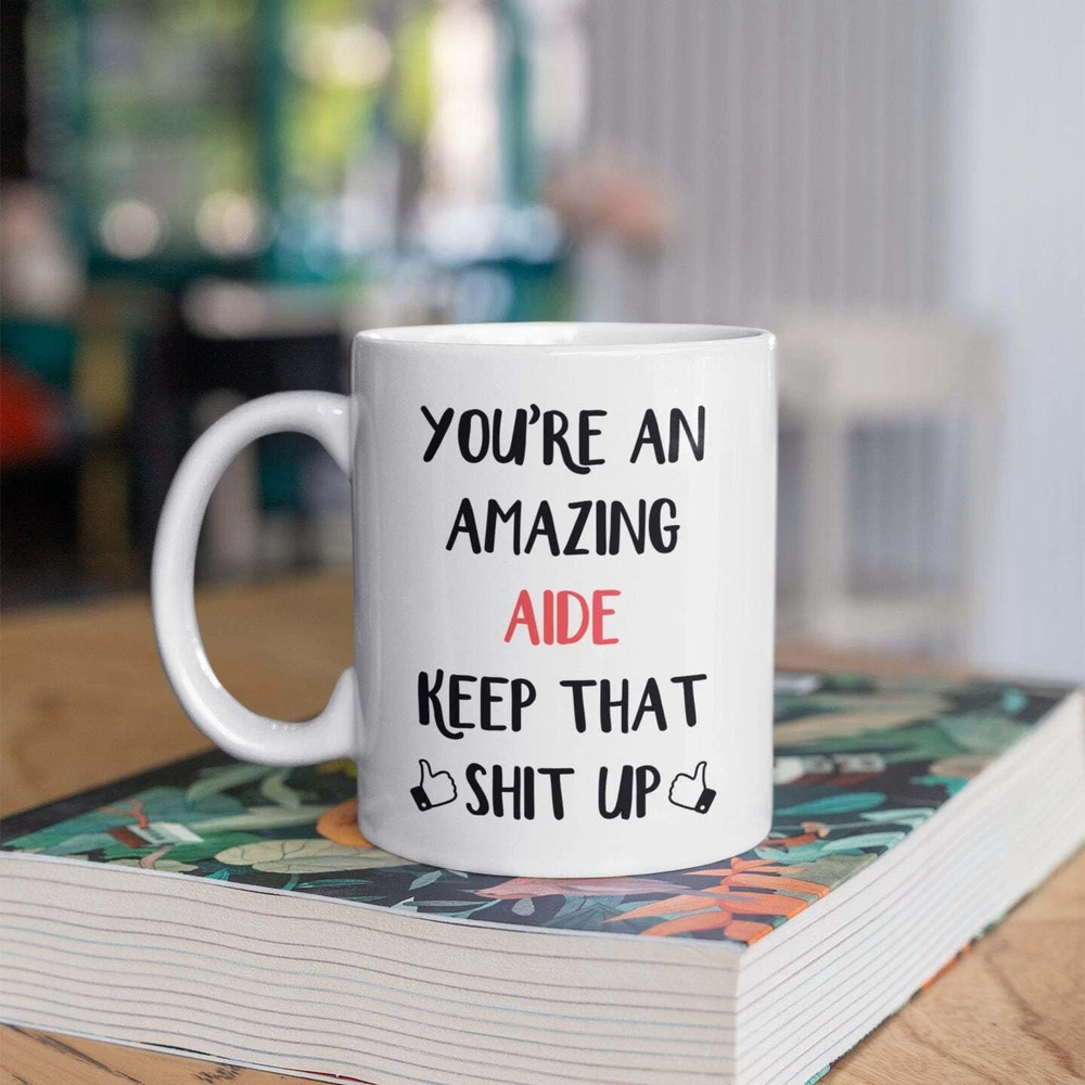 Aide Gift Mug For Aide Aide Mug Gift For Aide Funny Aide Gifts Product Details.. This high quality 11oz. ceramic white mug has a premium hard coat that provides crisp and vibrant color reproduction sure to last for years. Perfect for all hot & cold beverages. The highest quality printing possible is used. It will never fade no matter how many times you wash it. Material: 100% Ceramic. Print both sides. Dishwasher and Microwave Safe. High Gloss + Premium White Finish. Printed in the U.S.A. Personalized & Custom. We support personalized and custom mug to add custom, when placing an order, you can add notes to the "order note" in shipping address section. Also you can contact us directly via message. Shipping Info. Ready to ship in 1 to 2 business days, All products are made-to-order and proudly printed in the United States. Shipped by USPS and DHL, You will receive your order in 5-7 days. Replace & Refund. All products are defective during shipping broken, chipped will be replaced free of charge. You are not satisfied with the product, we will refund 100% money to you. If any other issues arise, please do not hesitate to message, we would be more than happy to assist you.