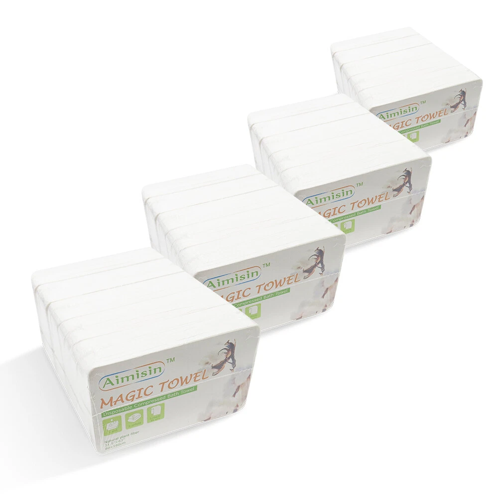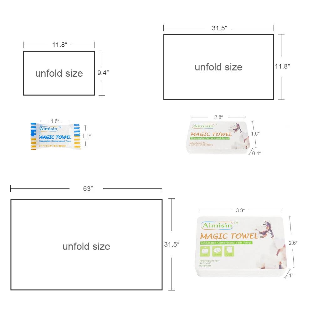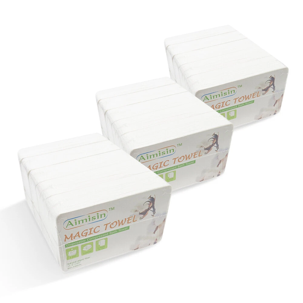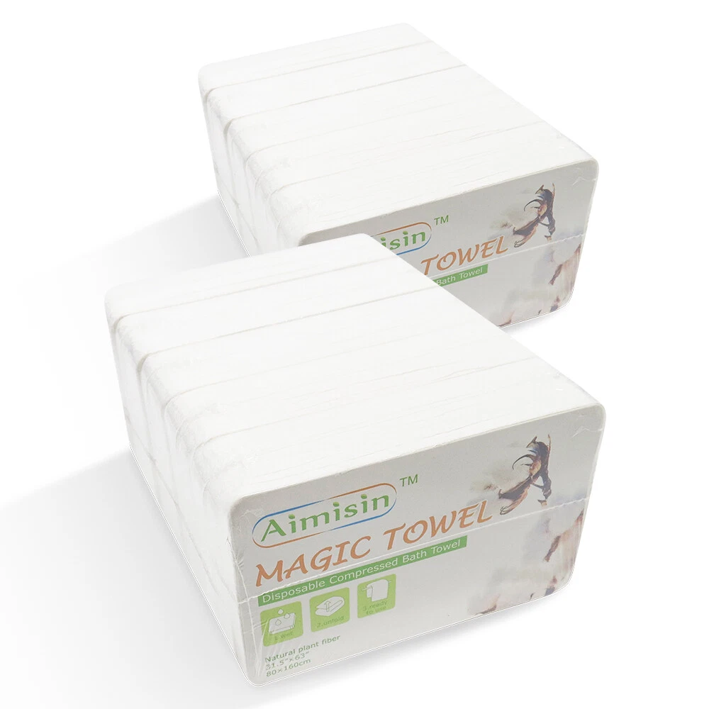 Aimisin Compre ssed Towel Video: Size: Bath Towel(L): Compressed Size: 3.9''x2.6'' Expanded Size: 31.5''x63'' Product Description: A imisin disposable compressed towels are made of 100% non-woven cotton fibers, so these magic towels are biodegradable and friendly to the environment. Our products are of good quality with SGS certificates, which include micro tests contamination tests, fluorescent whitening agents tests, and skin irritation tests. 90gsm non-woven cotton makes it thicker and more durable than common compressed towels. Individual packaging makes it portable so that you can take it anywhere. Compressed towels are easy to use, with a little bit of water the compressed towel will expand and unfold. It is great for indoor and outdoor use. Also, it is a perfect gift for your family and friends, they'll love the convenience. Aimisin Magic Towel Features: -Soft & Durable: Super soft fabric makes people feel comfortable. 90gsm non-woven cotton makes it thicker and more durable than common compressed towels. So in fact, you can use it multiple times. -Ultra Absorbent & Skin Safe: Absorbent enough for daily use. No chemicals or detergent, natural friendly for baby and kids even fit for sensitive skin. -100% Cotton & ECO-friendly: Aimisin compressed towels are made of 100% non-woven cotton fibers, Biodegradable and ECO-friendly. -Individual Package & Portable: Candy packaging, compact and portable. Every compressed towel is individually packaged, easy to take it out. -Easy to use: Just add water! the compressed towel will expand and unfold, then you can use it to wipe your body. -Multifunction: Compressed magic towel is ideal for bathroom, office, business trip, travel, camping, hotel, hydrotherapy center, and any place you can imagine. After cleaning the face can also be used to clean the surface of the kitchen, refrigerator, furniture, and glass items. Detail Pictures: SGS Certificates: Microbial Contamination Te st: Fluorescent Whitening Agents Test: Skin Irritation Test: Precautions: 1. The towel after use can not be dissolved, do not throw it in the toilet. 2. Manual measurement, there may be 1-2 cm error, thank you for your understanding!