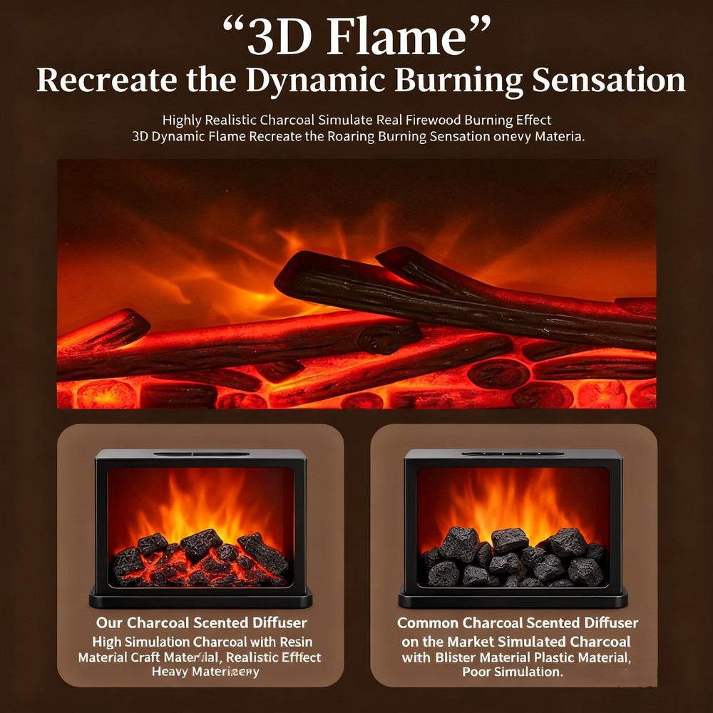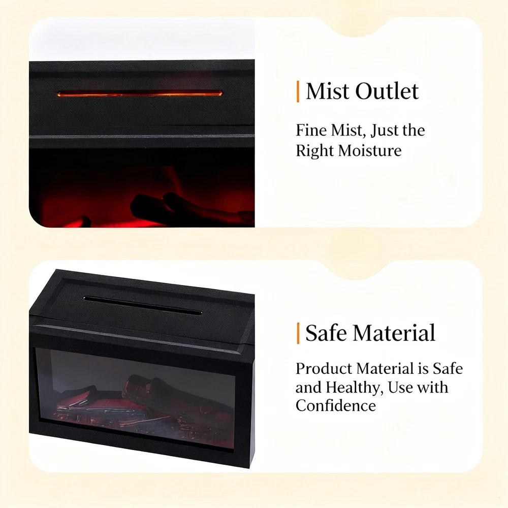 Features: 1. Multi-Functional 3-in-1 Device: The fireplace flame humidifier combines humidification, fragrance diffusion, night light, and ambient lighting in one. With a 140ml capacity, simply add 3-5 drops of essential oil to fill your room with a pleasant scent, increase air humidity, and provide a warm, comforting light to accompany your sleep. 2. Realistic Visual Experience: Our simulated flame aromatherapy machine uses unique fireplace design and ultrasonic atomization technology to quickly convert water and essential oils into fine mist. The combination of mist, fireplace appearance, and lighting creates a realistic flame effect, adding warmth and vitality to your space. 3. Colorful Lighting Modes: The aroma air humidifier features 7-color ambient lighting. The mist light, ambient light, and fireplace light can operate independently. Choose different lighting effects based on your mood or occasion to create the ultimate unique atmosphere. 4. Low Noise and Wide Application: The bedroom lasting fragrance machine operates quietly, creating a peaceful and comfortable environment. Ideal for office, bedroom, and various other settings, it effectively improves air quality, helps relieve stress, and promotes relaxation. Specification: Material: ABS+PP+ electronic components Color: Black Rated input: 5V 2A Rated power: 5W Working current: ≤900mA Water tank capacity: 140ml Spray volume: 20-25ml/h Timed shutdown: no water and power failure protection Package Included: 1 x Fireplace Flame Humidifier 1 x Power Cord 1 x Manual