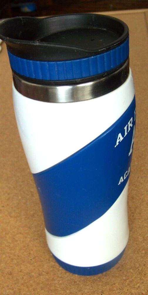 AF Air Force Academy metal interior travel mug water bottle slide open/close This blue and white metal travel water bottle measures about 8.5" tall, about 2.6" in diameter at the bottom. The slide open/close cover that is push on / pull off. Excellent condition, no major problems, has some light nicks and scuffs. Don’t forget to click on my "Stores" link, next to my eBay name, to see other items I currently have listed for sale, or you can copy and paste this address into your browser: stores.ebay.com/highcountrycollectibles SHIPPING INFORMATION Shipping to U.S. addresses is FREE! HIGH COUNTRY COLLECTIBLES Since 1989 – A LEADER IN THE DENVER SPORTS MEMORABILIA MARKET. Check out my other auctions and listings, and keep an eye out for the different, unusual, and EXCLUSIVE items available nowhere else but from High Country Collectibles