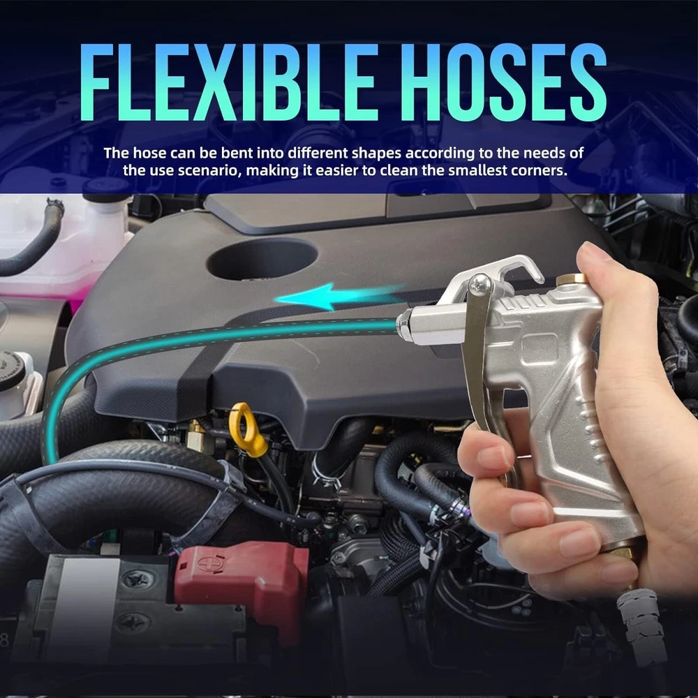 [Flexible Universal Air Blow Hose] -- Easily clean hard-to-reach narrow gaps, inside pipes and machine parts. [Short Nozzle] -- Adjustable copper nozzle rotates to control air flow volume, suitable for general scenes. [Straight Gun Nozzle] -- 3.7 and 6.4 inches, used in the more difficult to enter the space, strongly concentrated air nozzle. [Strong Airflow] -- Quality air compressor tools with high volume air flow, ideal for carpentry workplace and industrial workshop dust or powders blow off. Also for car repair shop cleaning work, household blind corner blowing off. [Air Tools and Accessories] -- You will get: 1 x air blow gun with standard quick coupling, 1 x adjustable air flow short nozzle, 2 x steel air flow extension, 1 x universal blow hose, 6 x sealing ring.