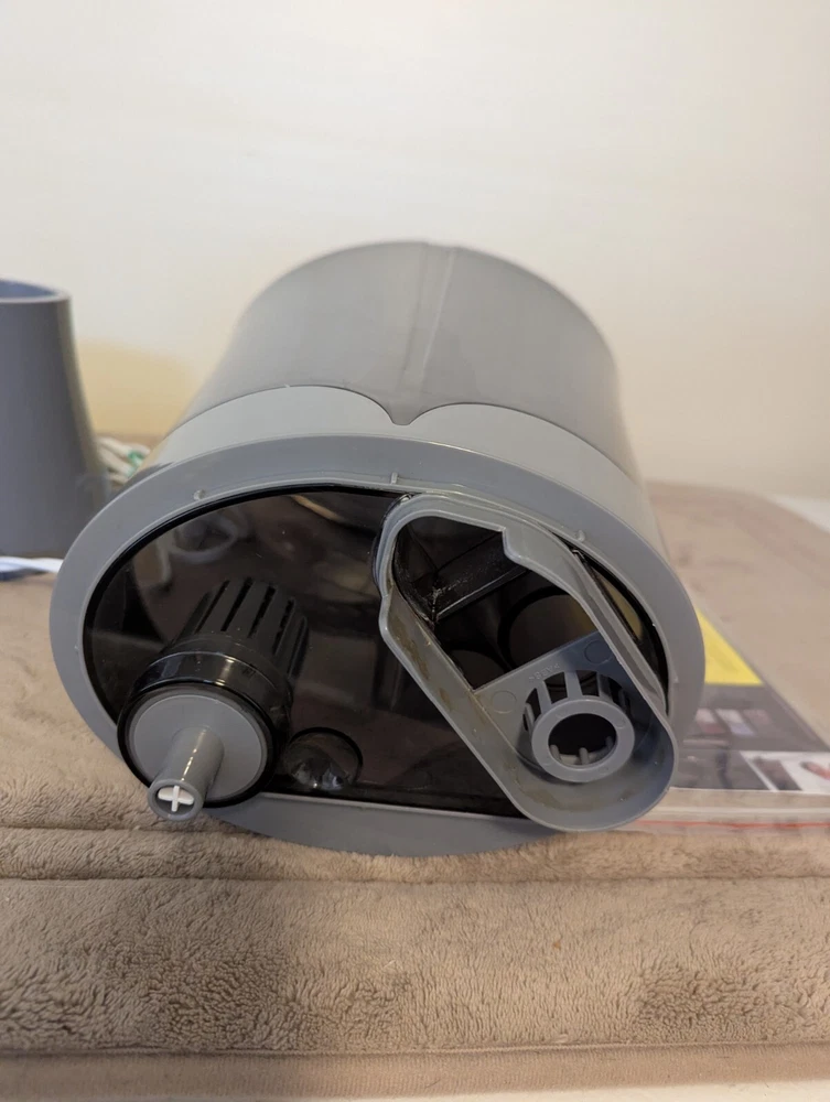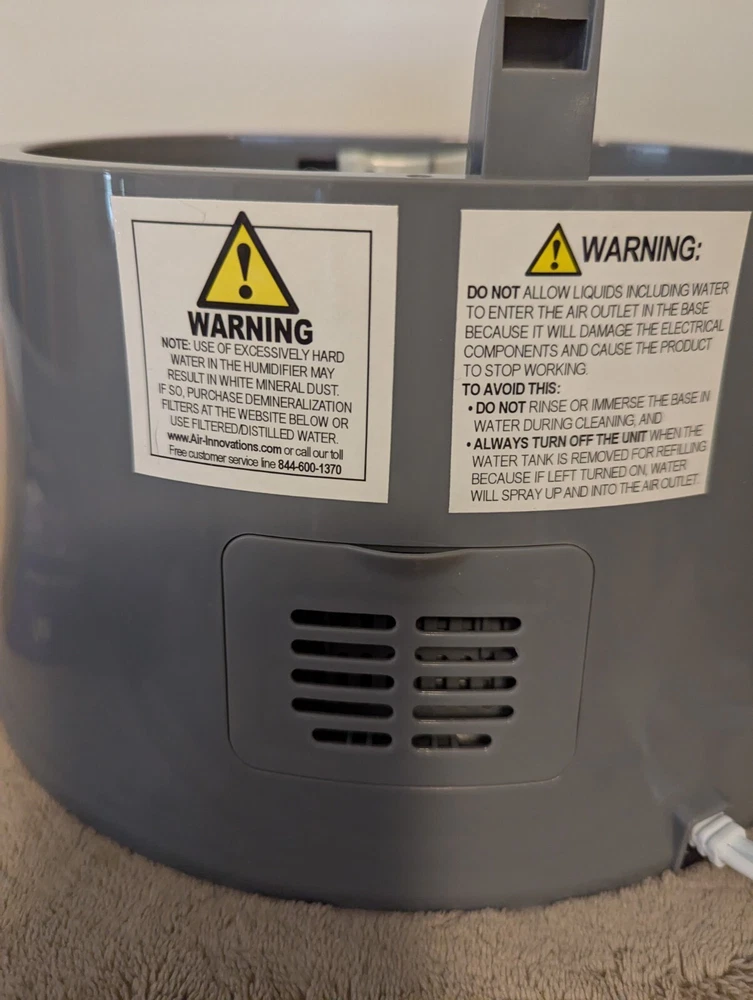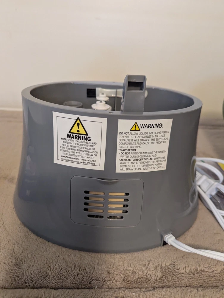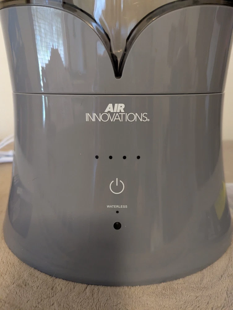 Air Innovations Clean Mist Top-fill Sensatouch humidifier and Aroma tray MH-903XL used no remote tested.and working properly. Pictures showing it operating and also when it senses no water in reservoir (pictures 2 and 3). Despite having no remote you can touch the sensor to manually adjust the speed. I used it once and then moved and have no use for it in my new home. Including in the purchase is the box of 11 lavender essential oil aroma therapy inserts-used 1. It can be used on the tabletop or floor and will run without needing to be refilled for up to 15 days on the low setting since the tank holds 2 gallons per manufacturer. The notch at the bottom of the wand is where it inserts into the cannister and is not a chip or damage (picture 16 and 17). Well cared for . I would also encourage you to use distilled or filtered water since manufacturer says this will prevent hard water staining. Includes the instruction manual as well. Packaged with care. Questions, please don't hesitate to ask. Thank you.