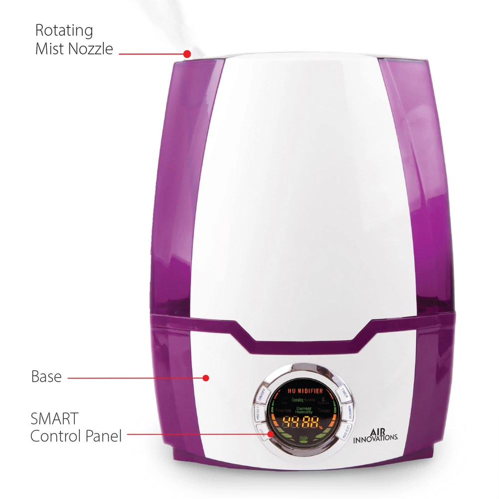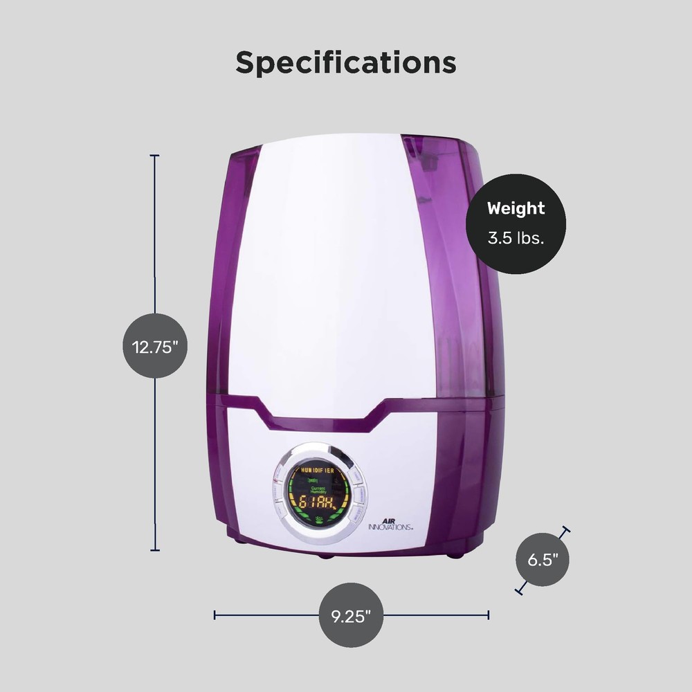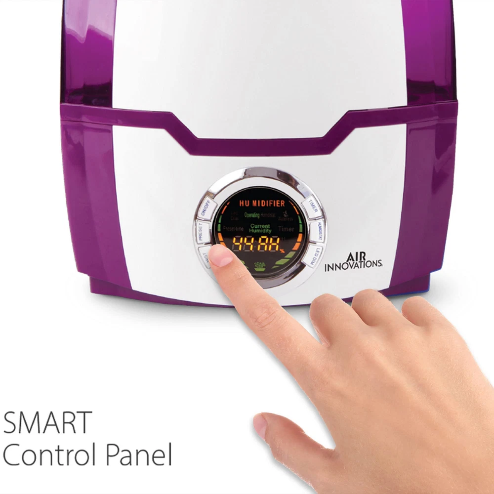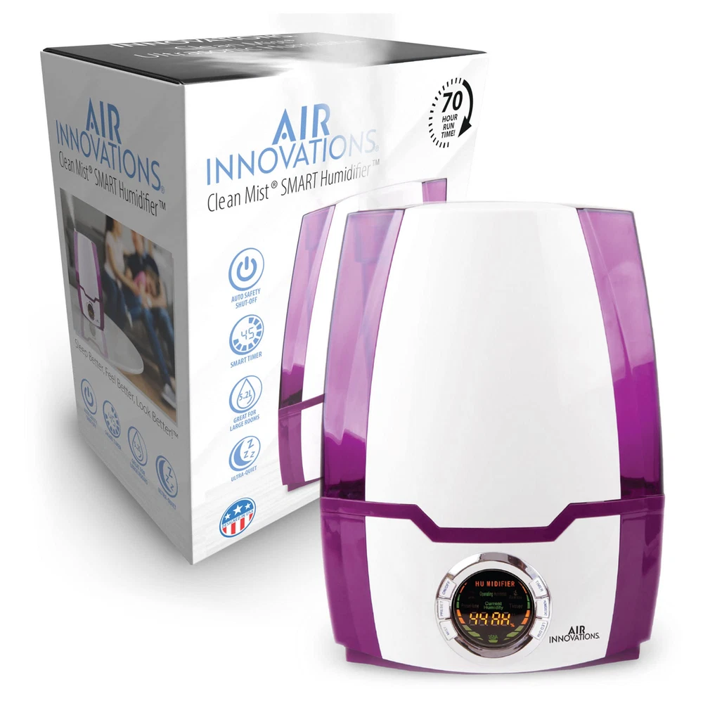 Breathe easier with the Air Innovations Ultrasonic Cool Mist Digital Smart Humidifier - Model 505A. For its size, it runs longer and it’s more versatile than any other humidifier on the market. This fully featured unit has a 1.37 gallon tank the runs up to 70 hours on low – that’s almost 9 nights of sleep before you have to refill it. The operation of this humidifier is silent for a peaceful night of sleep, yet it’s powerful enough to add humidity to large rooms up to 400 sq. ft. Other features include: built-in programmable humidistat that monitors and maintains the humidity levels that you set, a permanent ceramic filter that traps impurities from water, and a 360 degree rotating mist nozzle helps direct the moisture where you want it. It also features a fully programmable timer that turns on and off when you want it to, top and bottom handles for easy filling and carrying, extra wide opening for easy filling, and an auto out-of-water shut off when it runs out of water. It will also help kids and babies because the extra humidity will relieve dry eyes, rehydrate skin, help scratchy throats and will help reduce snoring for better sleeping. It also protects and rehydrates furniture, wood cabinets & floors and acoustic & electric guitars. Operates silent for long, uninterrupted sleep Puts clean, pure moisture back into the air Includes Aromatherapy Tray For large rooms up to 400 sq. ft. 4 mist settings: Low, Medium, High, Supreme Permanent ceramic filter never needs replaced Runs up to 70 hours on the low Auto shut off setting Digital LED display for easy operation Dual directional mist nozzle to point mist where you want it Adjustable humidistat to set the humidity level you want 24-hour timer 1.37 gallon tank Measures 9.25" L x 6.5" W x 12.75" H 1-year limited manufacturer's warranty Permanent Ceramic Filter That Never Needs Replacement | Programmable Built-in Humidistat That Monitors And Maintains The Humidity Level You Set 6.2L EXTRA LARGE WATER TANK: Impressive 6.2L super large water tank which keeps your Room-Humidifier running for over 70 hours on a single fill SILENT OPERATION & AUTO SHUTOFF: This baby humidifier runs almost silent to guarantee a full night's sleep without interruption, making it ideal for the bedroom. It also has an auto shutoff for your safety Runs For A Full 70 Hrs On Low (almost 9 Nights Of Sleep) And Is Completely Silent When Running As It Was Designed To Operate Quietly For Uninterrupted Sleep Fully Programmable Timer To Turn It On And Off When You Want It To | Auto Safety Shut Off And Audio Beep When It Runs Out Of Water