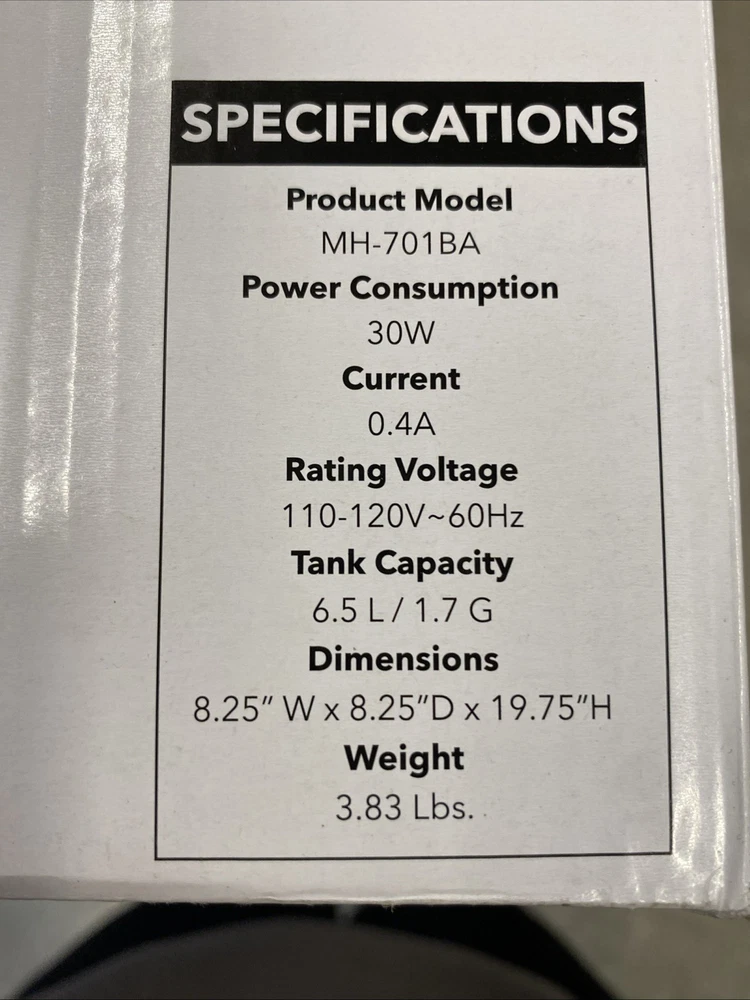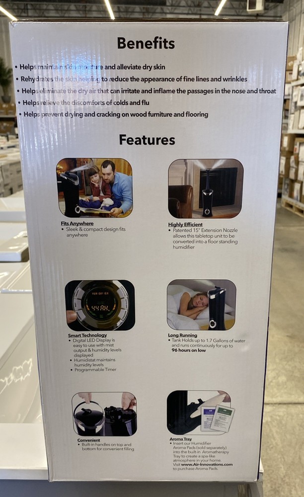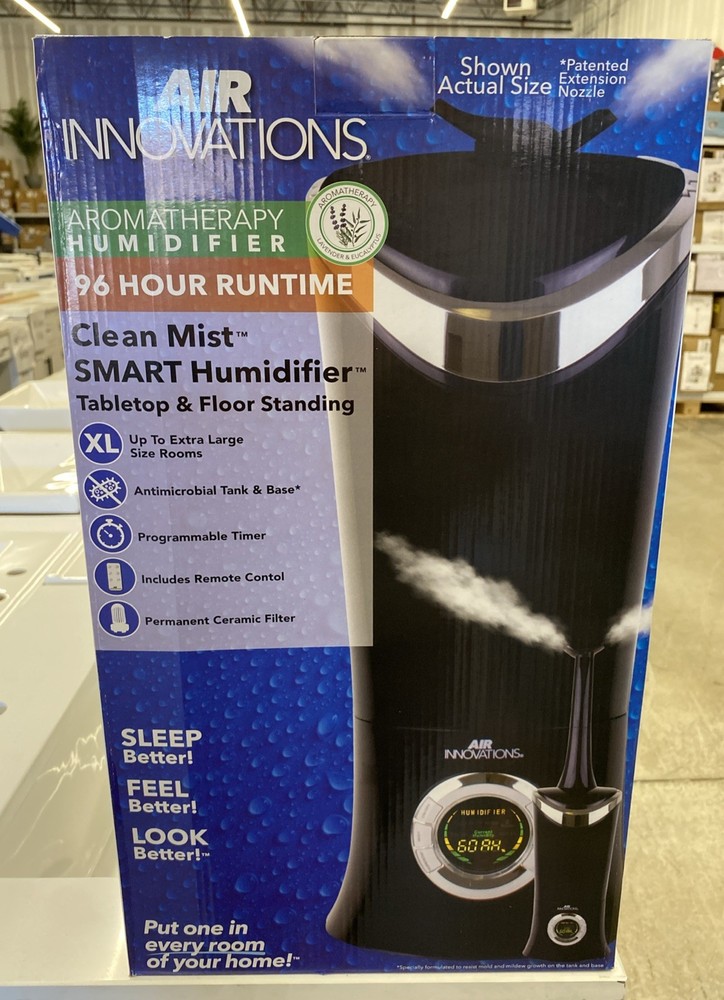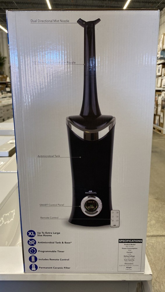 Air Innovations MH-701BA Ultrasonic Cool Mist Humidifier — XL Room High-capacity humidifier designed for large bedrooms and living spaces. Quiet ultrasonic operation with adjustable humidity and aromatherapy tray. Features • 6.5L / 1.7 gallon large tank • XL room coverage • Remote control included • Programmable timer • Permanent ceramic filter • Auto shut-off safety • Aromatherapy compatible • Quiet operation for bedroom use