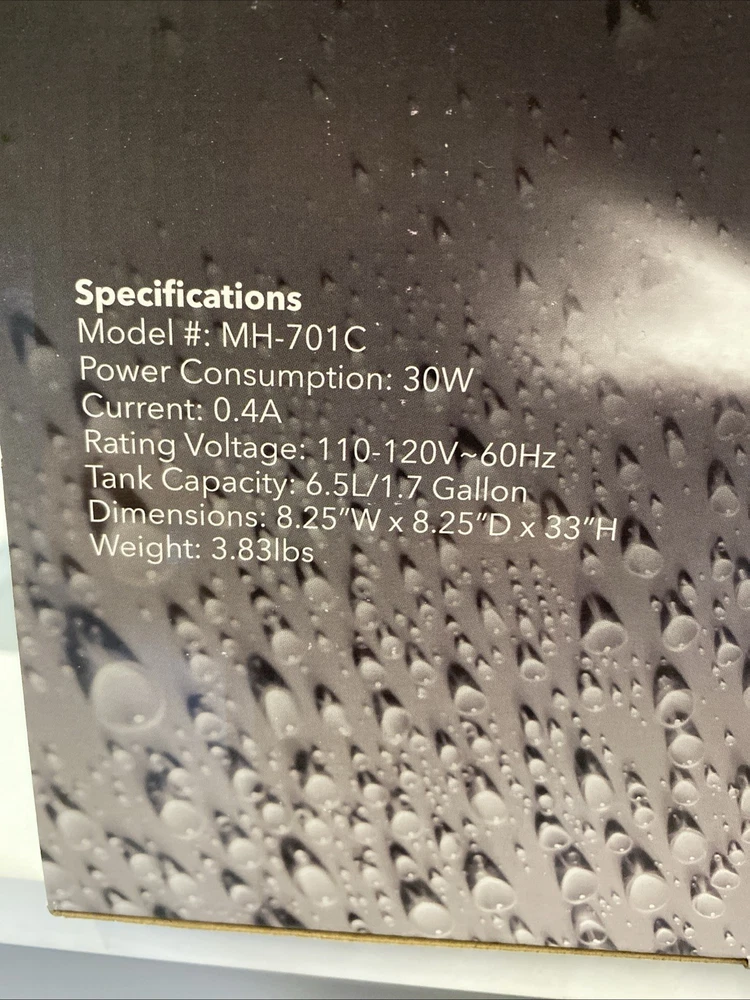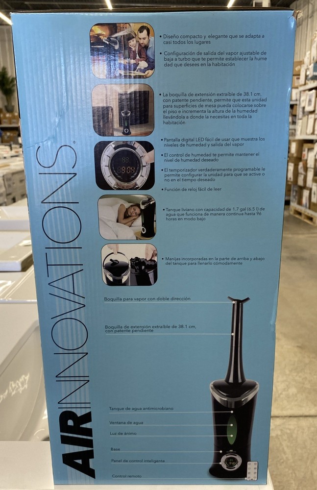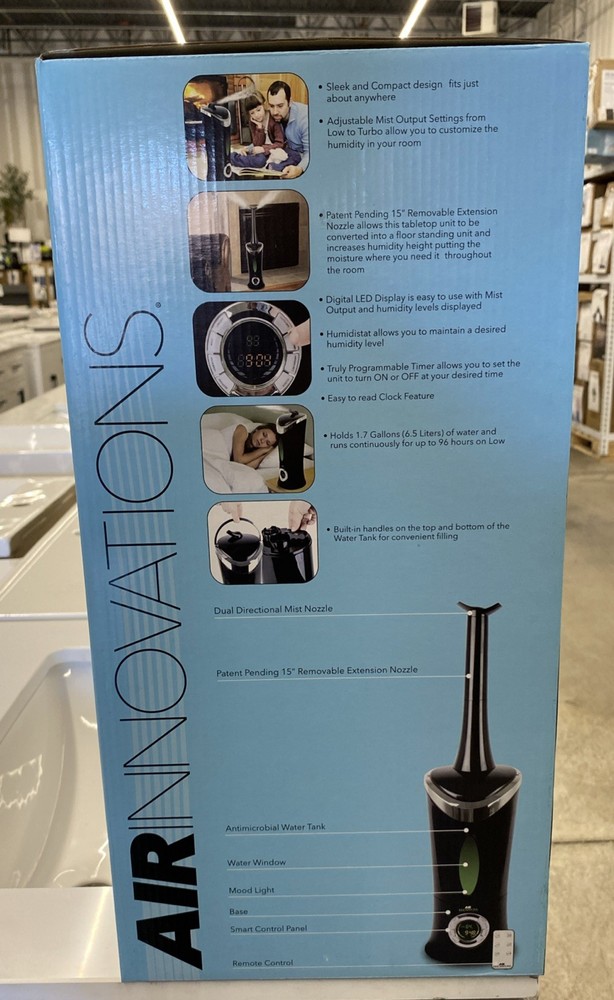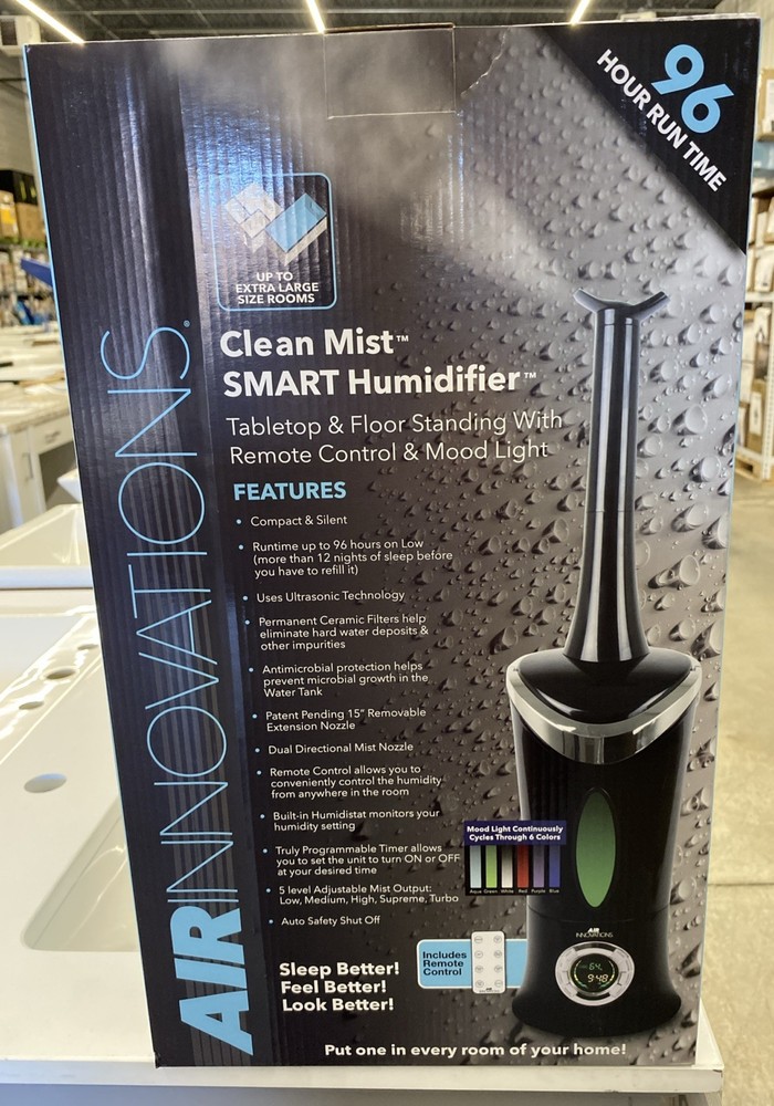 Air Innovations MH-701C Ultrasonic Cool Mist Humidifier – Large Room Brand new unit in original packaging. Ideal for bedrooms and living spaces. Quiet ultrasonic operation with adjustable mist levels and built-in aromatherapy tray. Features • Large room coverage • 1.7 gallon tank for extended run time • Remote control included • Adjustable timer & humidity levels • Auto shut-off safety • Night light function • Aromatherapy compatible Coverage Up to ~600 square feet