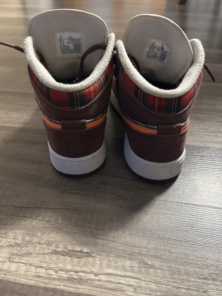 The Air Jordan 1 Mid SE GS "Plaid" sneaker in a Night Maroon Size 6y is a stylish and comfortable shoe for casual occasions. Featuring a round toe, lace-up closure, and rubber outsole, this shoe offers moderate cushioning and standard shoe width for a comfortable fit. The retro theme, leather upper material, and logo accents add a touch of flair to this athletic shoe from the Air Jordan product line. Perfect for summer, fall, or spring, this sneaker is ideal for basketball or everyday wear for both boys and girls.
