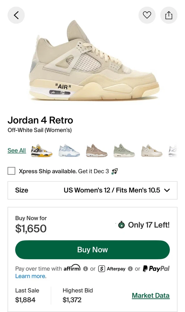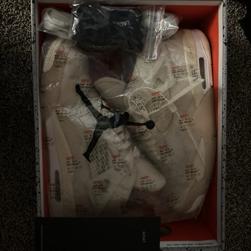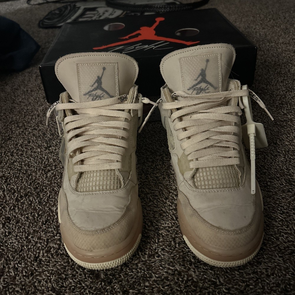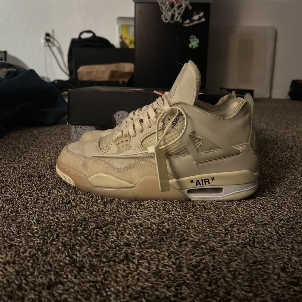 The Air Jordan 4 Retro SP Sail Off White in size 10.5M/12W is a stylish athletic sneaker with a mid-top shoe shaft style. Manufactured by Jordan in 2020, this beige sneaker features a unique color combination of Sail, Muslin, White, and Black. Perfect for women, this model is part of the Air Jordan product line and known by the nickname "Sail". With a classic Jordan style and comfortable fit, this shoe is a must-have for sneaker enthusiasts looking for a trendy and versatile addition to their collection.