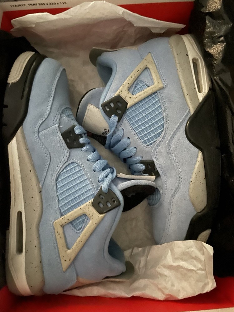 The product is a pre-owned Air Jordan 4 Retro University Blue GS in size 5.5Y. This low-top sneaker features a suede upper material in a classic blue color, making it suitable for both boys and girls. The Air Jordan 4 model is part of the Air Jordan product line and is designed as an athletic shoe, perfect for kids who love both style and performance. With its iconic Jordan brand and timeless design, this shoe is a must-have for any young sneakerhead.