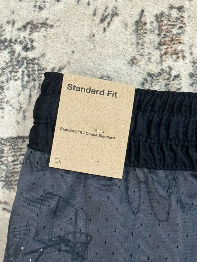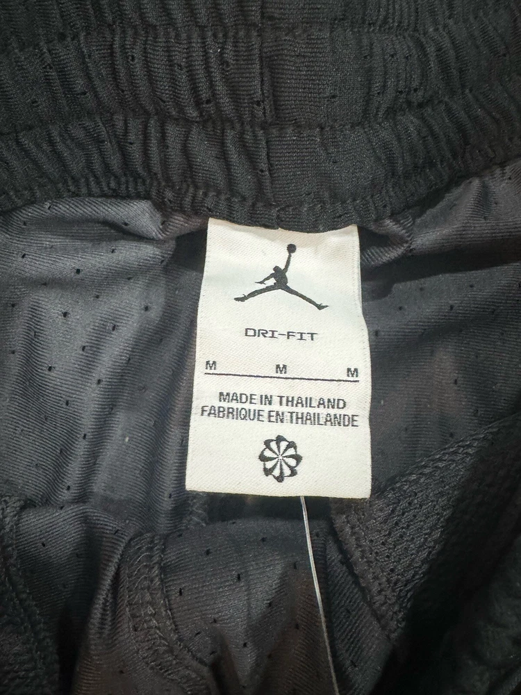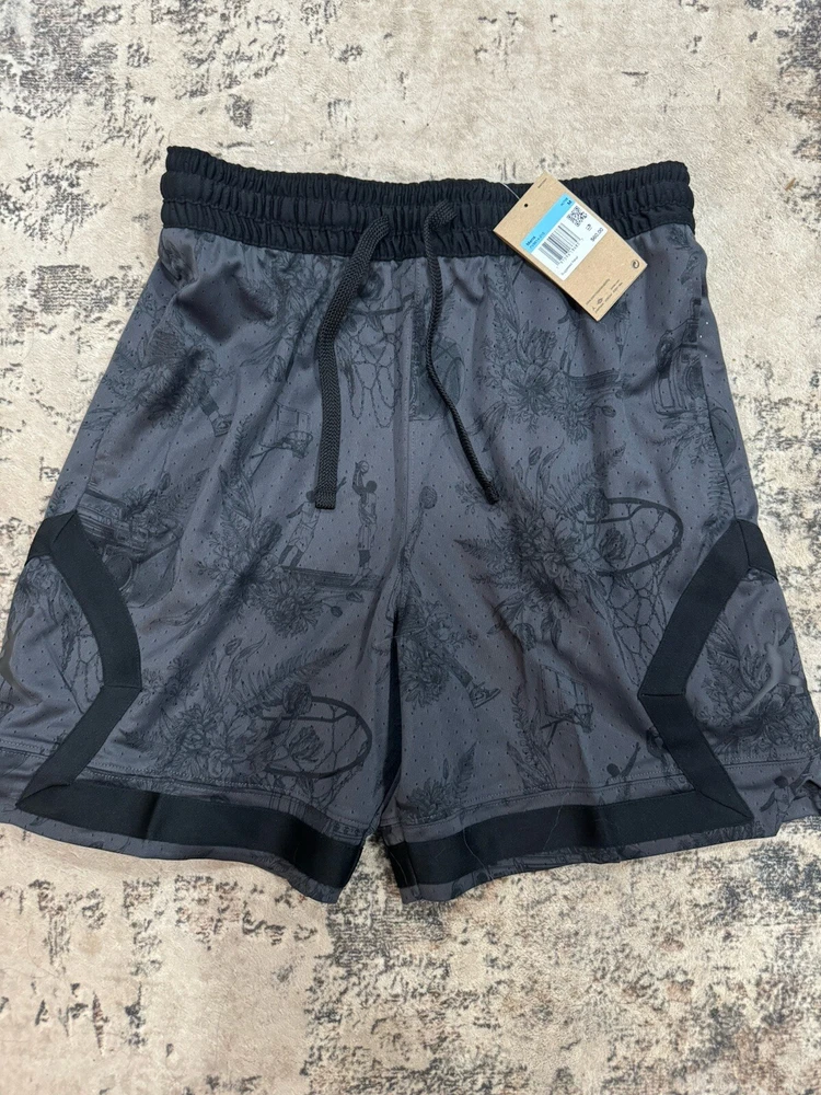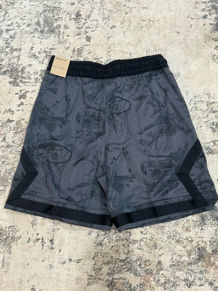 The Air Jordan Sport Dri-FIT shorts are designed for men in size M with a stylish black and gray diamond print. Made of 100% polyester mesh fabric, these athletic shorts feature a drawstring closure, elastic waist, and pockets for convenience. Ideal for activewear, the shorts are part of the Nike Dri-FIT product line, offering moisture-wicking, quick-dry, and breathable properties. Perfect for basketball enthusiasts or anyone looking for comfortable and lightweight shorts during the summer, fall, or spring seasons.