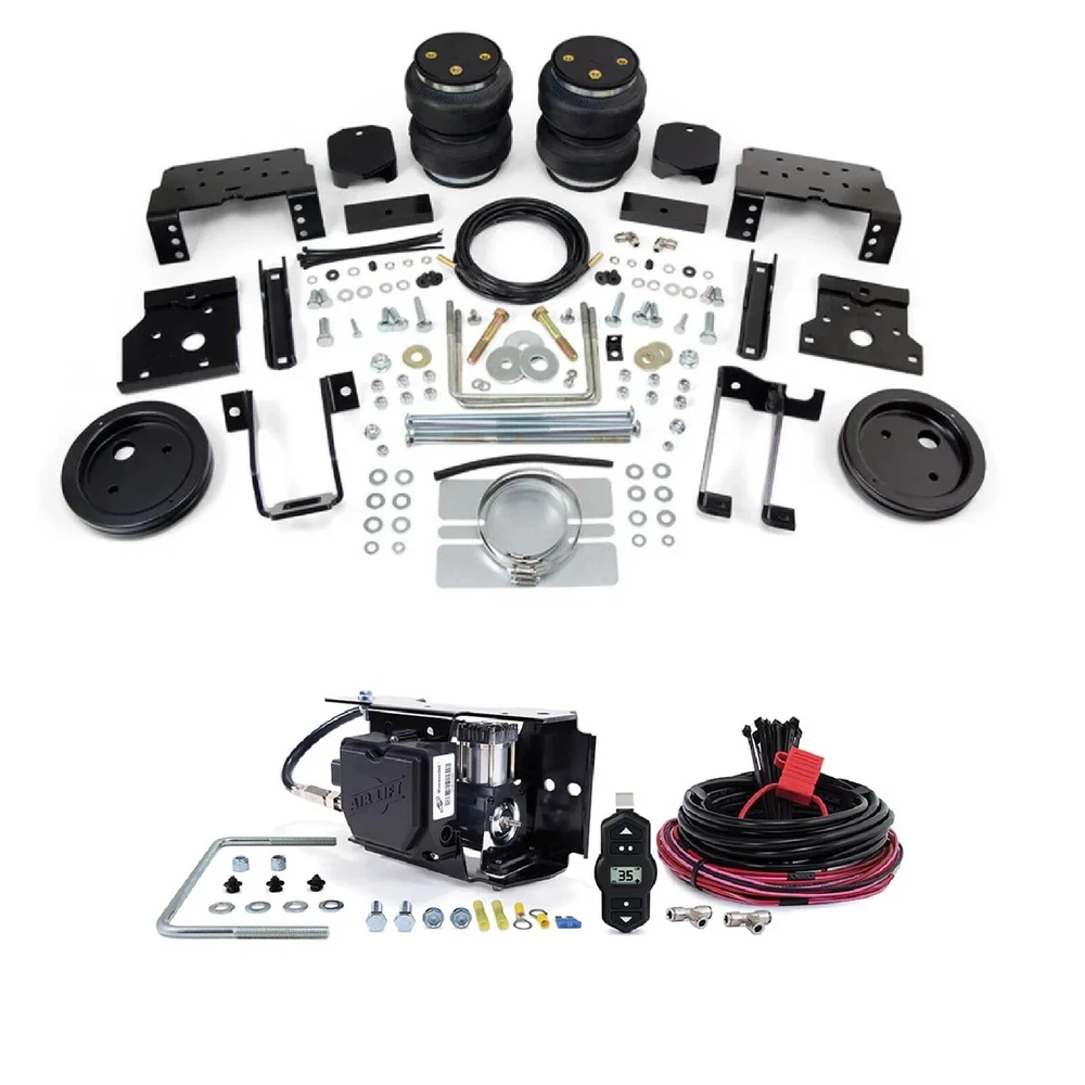 $ImageURL1$ Air Lift LoadLifter Air Springs & WirelessOne Compressor for Ford F250 F350 F450 PART NUMBER: 88396 / 25980EZ BRAND: Air Lift DESCRIPTION LoadLifter 5000 Ultimate Air Spring Kit All the goodies of the LoadLifter 5000 air spring kit with an internal jounce bumper inside - giving you the ultimate in lift, ride comfort, and safety. It eliminates harsh jarring on rough roads, provides three-stage ride comfort, replaces factory jounce bumper and it's maintenance-free! Safely run with zero air pressure. The kit includes all the necessary mouting brackets, all of the hardware needed for installation, internal jounce bumper prevents damage when driving with an empty air bag, 2 air springs, air lines, schrader valve and fully-illustrated installation guide. Features Internal jounce bumper prevents damage when driving with an empty air bag, so you can operate safely at 0 PSI Exclusive Air Lift air spring kit Up to 5,000 lbs. of load-leveling capacity Three-stage ride comfort, absorbing shock and vibrations from rough roads and uneven terrain Fitment Notes 2011-2016 Ford F-250 Super Duty 4WD 2011-2016 Ford F-350 Super Duty 4WD 2011-2014 Ford F-450 Super Duty 4WD (Non Commercial Chassis) Fits single rear wheel (SRW) and dual rear wheel (DRW) models. Will fit ALL models without a fifth-wheel hitch and will also fit most side mount fifth wheel hitch applications. Does not fit cab & chassis applications. Fits factory in-bed hitch system. Does not fit Commercial Chassis. WirelessOne Manifold & Compressor w/ EZ Mount WirelessOne is a single-path, wireless control system including a standard-duty compressor. Air springs are controlled with the wireless controller or a compatible smartphone, and our free app is programmable with up to three user-defined presets. WirelessOne + EZ Mount features our EZ Mount, allowing for a cleaner, quicker install. WirelessOne Tank + EZ Mount has a 2-gallon auxiliary air tank for quicker air spring inflation and less compressor cycling. Features Works with most brands and styles of air springs, including Air Lift System able to be controlled from included remote or the WirelessAir app Single-path control: Left and right air springs are inflated/deflated equally Easy installation - no air lines to the cab Includes EZ Mount installation bracket with upgraded compressor