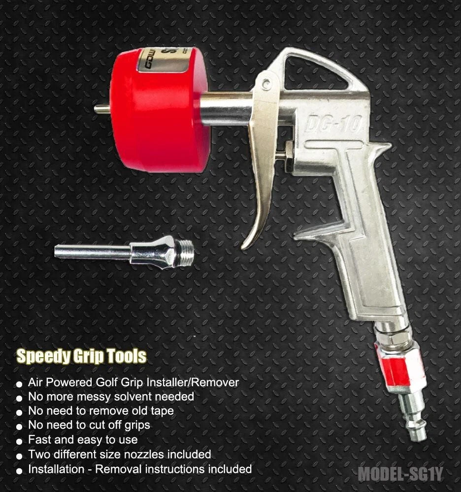 Speedy Grip Air Powered Golf Grip Reover Tool, Fast and easy to use. No more messy solvent needed No need to remove grip tape No need to cut off grips Two different size nozzles included. Installation and removal instructions included Model:SG1 Note: Intended to be used with an Air Compressor