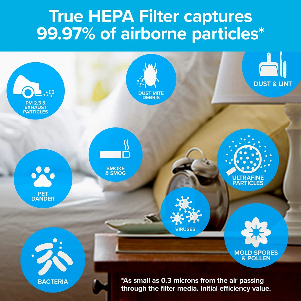 Cleaner indoor air can be yours—even if you don’t have an HVAC system. The Room Air Purifier device and its filter help reduce airborne particles in the air you breathe. This stand alone unit works well in medium sized rooms and includes a True HEPA Filter that captures 99.97% of particles you can’t see, such as mold spores, pollen, pet dander and more* (*Disclaimer: As small as 0.3 microns from the air passing through the filter media. Initial efficiency value) CLEANER AIR CAN BE YOURS; The Air Purifier device and its filter help reduce airborne particles in the air you breathe INCLUDES A TRUE HEPA FILTER that captures 99.97% of airborne particles you can’t see (Disclaimer: As small as 0.3 microns from the air passing through the filter media. Initial efficiency value) PARTICLES CAPTURED include dust, lint, dust mite debris, mold spores, pollen, pet dander, smoke, smog, bacteria, viruses, PM 2.5, exhaust particles, and ultrafine particles CLEANS MEDIUM ROOMS up to 150 square feet with a smoke Clean Air Delivery Rate of 107 CADR BUILT IN ELECTRONIC FILTER CHANGE INDICATOR on the control panel will turn on when a new filter is needed so you never miss a filter change SOFT TOUCH CONTROLS help you easily change fan speeds, set a run timer, dim the control panel lights, and reset the filter change indicator REPLACE YOUR FILTER EVERY 6 MONTHS with the Premium Allergen, Bacteria & Virus True HEPA replacement filter, F2 size (Disclaimer: Based on 12 hours of use per day) FOR RESIDENTIAL use only knows your home filtration needs are as unique as you are, that’s why we’ve designed a family of room air purifier filters and devices to fit your lifestyle - from small to large rooms; True HEPA, to Odor Reduction - has you covered