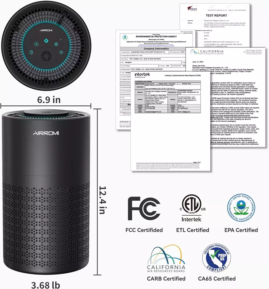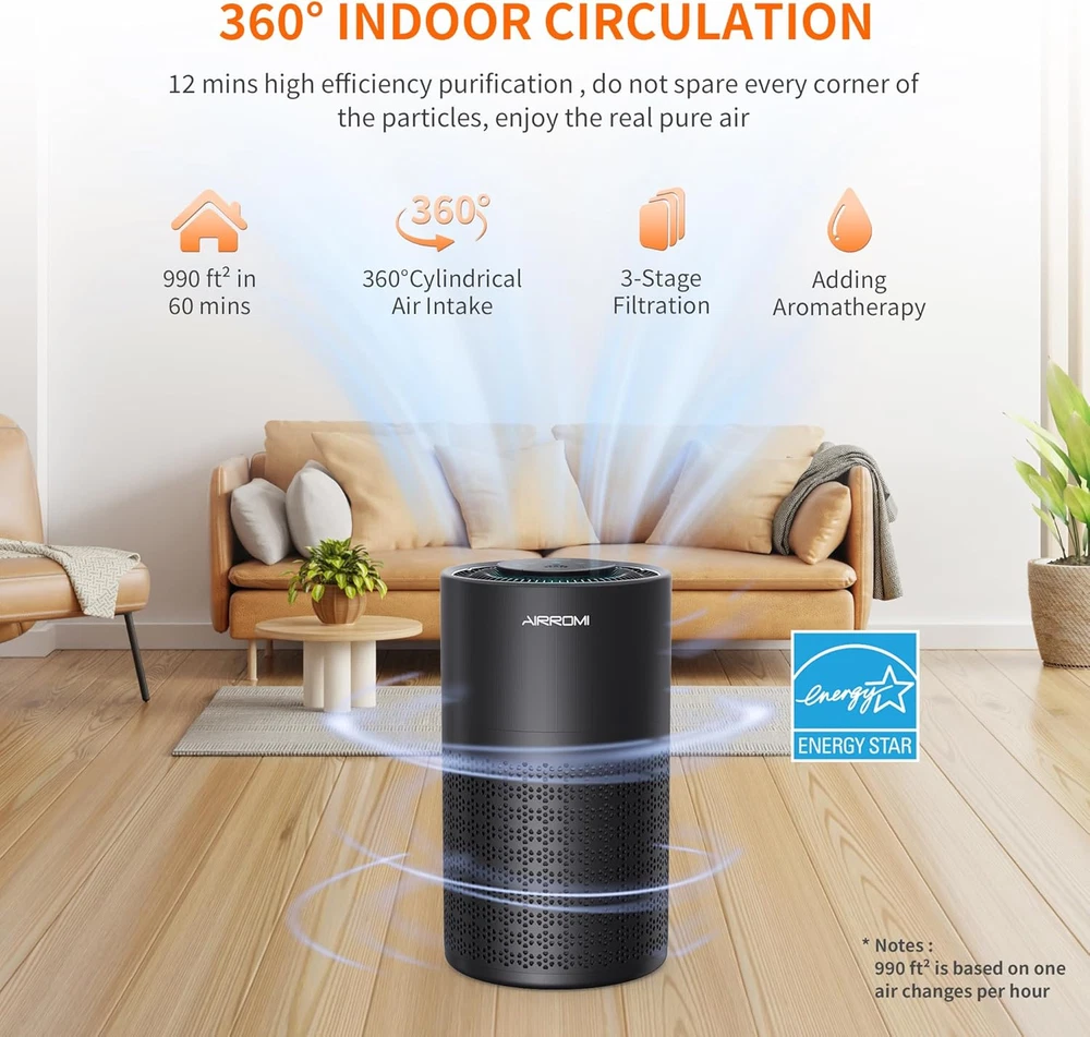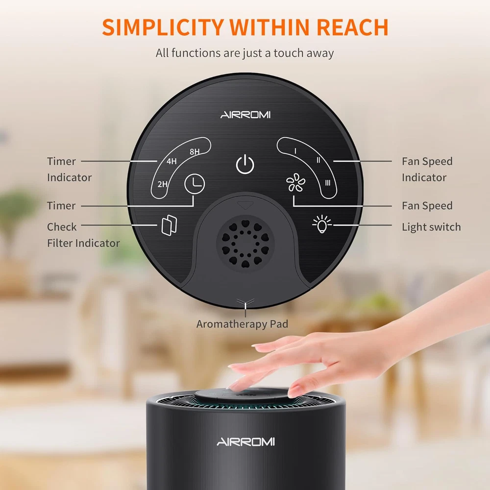 đăSuper Purificationă: Our Size: 6.9"D x 6.9"W x 12.4"H, though this portable air purifier is compact, it can generates more than 673.6gal/2550L clean air /min. AIRROMI A2001 bedroom air purifier utilizes 2023 newly advanced filter system: 40 ppi pre-filter, True HEPA filter, and activated carbon filter. This combination effectively captures 99.97% of particles as small as 0.3 microns, including pet dander, hair,pollen, smoke, Kitchenodors, dust and Mold Smoke . AIRROMI A2001 Air Purifier just want to help you to breath the cleaner air. đă360° Effective Purificationă:Thanks to a large air intake at the bottom, AIRROMI air purifiers has a 360° air intake, so air will enter from all directions, create a effective purification. Btw, A2001 Air Purifier air purifier produces clean air up can coverage up to 990 square inches room.ïŒDifferent countries have different formulas for calculating area. It means it can cover up two small rooms or one large room.) When you need to replace it, you will be shocked at how strong the adsorption capacity of the old filter. đăWidely UseăïŒA 18W energy-saving long-life motor suitable for everyone. If you are a pet owner, I guess we can meet your require, cause this purifier can effectively absorb cat litter smell or dog hair, Btw, after cooking, you don't need to open the window, the purifier will help you to clean the air. And it also good for smokers, babies or children, and suitable for living rooms, bedroom, dorm, kitchen, office,classroomsïŒnursery or apartment. đ§ăEasy to Use & with HEPA Filter Replacement Alarmă:AIRROMI air purifiers are easy to install with a concise instruction manual. And when the air purifier needs to be replaced, the button of the screen will flash a yellow light to remind you. You just need to hold down the button for 3-5s, then replace the filter.The replacement HEPA filter should be replaced every 3-6 months depending on the environment and usage frequency. And purifier must match original filters, or it might be damage. Filters search for ASIN B0C4P3XCP6 on Amazon. đșăAromatherapy Air Purifieră: AIRROMI air purifier features aromatherapy functionality, allowing you to use essential oils on the aromatherapy pad at the top of the purifier. Try dripping fragrances onto the pad start with 5-6 drops, then add 3-4 drops after an hour to gradually release the aroma absorbed by the pad. Note: Different oils may produce varying effects based on their scents. đăAir Purifier Quiet & Earned the Certifiedă:The noise level of the hepa filter air purifiers is as low as 23 dB, is as silent as your own breath, ensuring a peaceful and undisturbed environment while still providing effective purification. And you don't need to worry about the quality of the product, all of our materials are carefully selected, and the air purifier has also undergone multiple quality tests, which earned the certified of CARB/EPA/ETL/CA65/FCC. â°ăHome Air Cleaner with Sleep Mode - Turn On/Off Night Light, 3 Timers, 3 Wind Speedsă: When you go to sleep, you can choose 1/2/3 wind speeds according to your prefer. And you can also choose the hepa air purifier timer if you need it, our timer has 3 modes: 2H 4H 8H. If you need a night light, the energy-saving lights of AIRROMI bedroom air purifier can be left on all night, which is a comfortable light, and of course, you can choose to turn off, depending on your personal preferences and needs. đăExcellent Designă: According to carefully designed, AIRROMI air purifier has a high-end appearance, this is the first use in the air purifiers industry, we've achieved a dipped and brushed metal texture on appearance, giving the air purifiers a stylish and sophisticated look. Almost everyone will marvel at this portable air purifier. Product Description AIRROMI A2001 Pets Filter Yellow AIRROMI A2001 Original Filter White AIRROMI A2001 Smoke Filter Blue AIRROMI A2001 Air Purifier Add to Cart Add to Cart Add to Cart Add to Cart Add to Cart Add to Cart Add to Cart Customer Reviews 4.5 out of 5 stars 3,087 4.5 out of 5 stars 3,087 4.5 out of 5 stars 3,087 4.5 out of 5 stars 3,087 4.5 out of 5 stars 3,087 4.7 out of 5 stars 434 4.4 out of 5 stars 285 Price $59.99 $ 59 . 99 $59.99 $ 59 . 99 $59.99 $ 59 . 99 $59.99 $ 59 . 99 $59.99 $ 59 . 99 $19.99 $ 19 . 99 $39.99 $ 39 . 99 Color Pearlescent White Profound Black Vibrant Orange Elegant Green Literary Purple Pearlescent White Pearlescent Black Item Dimensions 6.9*6.9*12.4 inches 6.9*6.9*12.4 inches 6.9*6.9*12.4 inches 6.9*6.9*12.4 inches 6.9*6.9*12.4 inches 6.5*6.5*6.5 inches 6.3*6.3*10.63 inches Weight 3.68 Pounds 3.68 Pounds 3.68 Pounds 3.68 Pounds 3.68 Pounds 260 Grams 2.61 Pounds Coverage Area Up to 990 sq.ft Up to 990 sq.ft Up to 990 sq.ft Up to 990 sq.ft Up to 990 sq.ft Up to 990 sq.ft Up to 765 sq.ft Filtering System HEPA original filter HEPA original filter HEPA original filter HEPA original filter HEPA original filter HEPA original filter Activated Carbon & HEPA Application Home/ Office Home/ Office Home/ Office Home/ Office Home/ Office Home/ Office Home/ Office