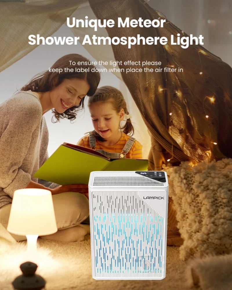 About this item [High Efficiency Air Purifier] The air purifiers for bedroom that covers up to 1736 feet within 1 hour. The home air purifiers have a powerful 4-stage filtration system that can efficiently capture 99.97% of air particles from all around as small as 0.3 microns. Turn on the high-efficiency air purifier large room to enjoy a new and comfortable air environment all the. [Original Patent: Unique Room Air Purifier Air Inlet Design] When turning on the HEPA air purifiers for home, the meteor shower light will turn on like an aurora, purifying the air while bringing the aesthetic enjoyment. 2 choosable light moods: light and strong. To ensure the light effect please keep the label down when place the air filter in. [Fragrance Sponge] The top of the large room air purifier is equipped with an essential oil cotton pad. Add the essential oil to enjoy fresh and fragrant air. [PM2.5 Detector] The built-in PM2.5 detector works while the air purifier for bedroom turns on, monitoring the real air quality. The larger the value, the worse the air quality, while the smaller the better. Please note that the PM2.5 value is for reference only and is not authoritative. [Ultra-Quiet Sleep Mode] The air purifiers for pets work at sleep mode at 15dB, which is ultra quiet. Enjoy a comfortable and soft environment when sleeping. All keys' light will turn off, while the meteor shower light should be turned off manually. [Filter Replacement Reminder] The air cleaner large room is equipped with a filter replacement reminder, guaranteeing to enjoy fresh air all the. When the filter reaches the end of the life, the reminder will turn red and flash. After replacing the filter, please press and hold the reminder button for 3-5 second, and the filter reminder will be reset. To ensure the purification effect of the HEPA filter air purifiers, please use official "LAMPICK" filter elements. [5 Timer Setting] The pet air purifier is designed with an adjustable timer for 2/4/6/8/12 hours. Set the usage flexibly and refresh the air at regular intervals. [3 Fan Speeds] The bedroom air purifier offers three choosable gears of air flow from Ⅰ, Ⅱ to Ⅲ. When the office air purifier works at the auto mode, the machine will automatically select the appropriate based on the air quality detected by the sensor. [Child Lock] Press the "Lock" button to lock the current setting of the smart air purifier at any to prevent children or pets from accidentally touching the buttons. Color White Brand LAMPICK Product Dimensions 12"D x 16"W x 6"H Floor Area 1736 Feet Specification Met FCC Certified, ETL Certified, CARB Certified Power Source ac Item Weight 8 Pounds Control Method Filter Type HEPA Air Purifier x1 HEPA Filter x 1 User Manual x1