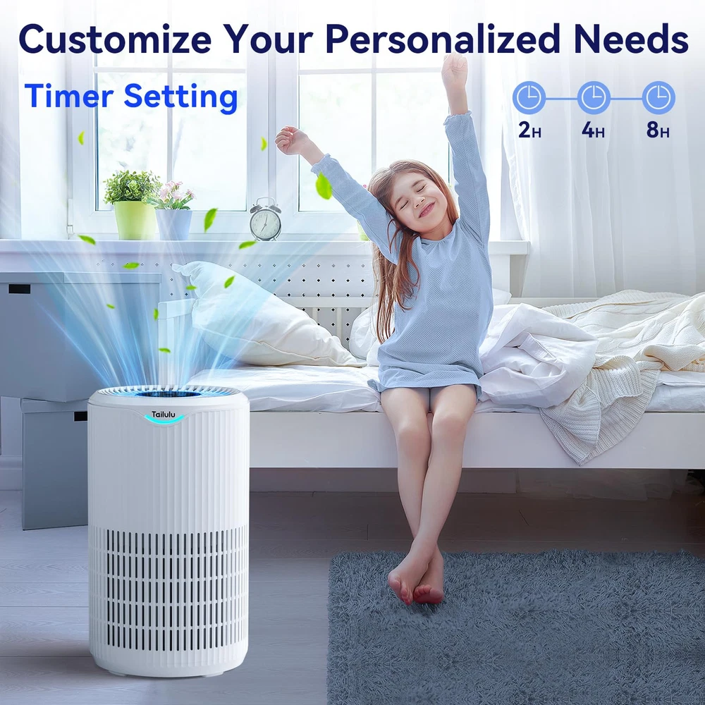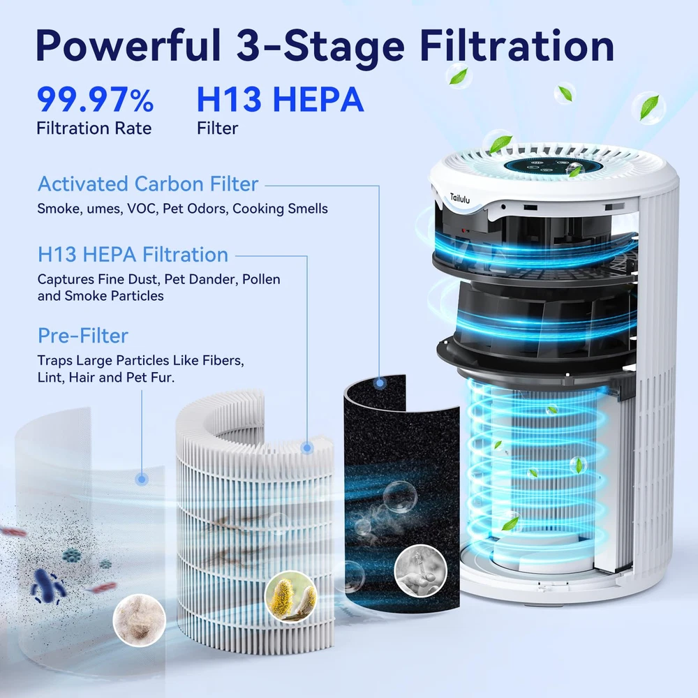 [POWERFUL AIR PURIFIER] D09 air purifier is equipped with a brushless motor and 360°air inlet design for efficient air cleaning and energy saving, changing air for a large room 375 ft² four times in 1 hour, saving more than 30% energy bills. The modern design suits any space from small to large rooms, bedrooms, offices, nurseries and kitchens. [HIGH-PERFORMANCE 3-STAGE FILTER] H13 True HEPA air purifiers adopt a 3-stage filtration system, including a pre-filter, H13 true HEPA filter, and charcoal filtration, which purify air particles as small as 0.3 microns such as smoke, pet hair, dander, dust, pollen, odors and cooking smell. It can also effectively help with sneezing, congestion, and other allergy symptoms caused by airborne contaminants. [WHISPER QUIET AIR CLEANER] The 2024 newest structure-designed air purifier for bedroom uses advanced noise reduction technology that reduces noise levels to a near-silent 22dB on sleep mode and you will not notice it is working while sleeping. Optional soft night light puts your mind at ease and makes you sleep deeper. [TIMER SETTING, 3 FAN MODES & FILTER REPLACEMENT REMINDER] 3 timer options (2H/4H/8H) allow you to customize the timer of the room purification time. Our HEPA filter air purifiers have 3 wind modes to meet your needs: high, low, and sleep mode. The smart filter indicator light will auto-on to remind you it’s time for a new filter. We recommend you replace the filter every 3-6 months depending on the environment and usage frequency. (Search B0BFX15HBS to find the D09 replacement filter.) [FULL CERTIFIED SAFETY & CHILD LOCK] Our home air purifier is FCC, ETL, EPA, and CARB certified (Available for California). 100% ozone-free, totally environment-friendly and safe for you and your whole family. Long press the child lock button for 3s to lock or unlock the touch panel to avoid error operation by kids or pets. [WORRY-FREE GUARANTEE] We provide our customers 1-year warranty and lifetime technical support, please rest assured. If you have any questions about air purifiers, please contact us directly, we offer online chat, email, and phone support. [WHAT'S INCLUDED] Air Purifier, Adaptor, Nanoseal HEPA Filter and Manual.