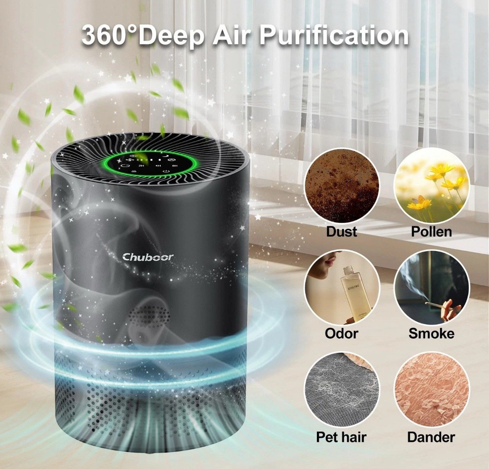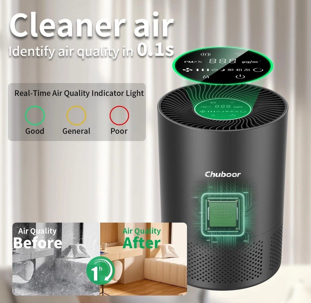 Color Black Brand Chuboor Product Dimensions 8.18"D x 8.18"W x 11.38"H Power Source AC/DC Item Weight 5.2 Pounds Control Method Touch Gives you fresh air in 1 hour: can you imagine it can monitor as fast as a shooting star? And it also gives different air quality tips in time. We use the most practical traffic light three-color method, red light-poor quality, yellow light-fair, green light-very good quality; isn't it very good to understand and identify? When you see the red light, you should leave quickly, and you can breathe the freshest air again in an hour. 360° Air Inlet: With H13 True HEPA technology, it effectively targets airborne particles of 0.1-0.3 microns, similar to all kinds of airborne particles, allergens, cat hair, etc. Enjoy quality air purification.360° air inlet ensures full coverage of your room. Suitable for all kinds of living environments, bedrooms, kitchens, mother's and baby's rooms, removes shoe odor, removes diaper odor, removes smoke odor from smoking rooms up to 2000 square feet. Leaves you with very clean and safe air. INTELLIGENT AUTOMATIC MODE DESIGN: Experience the benefits of quiet operation at only 20 decibels, providing you with a peaceful environment for rest and relaxation. Unique Smart Mode Design automatically switches sleep modes according to the environment, bringing you a quiet, intelligent sleep; a very competent babysitter. It's a design that frees your hands; Breathing Light Design:The Chuboor PB01 air purifier is not only efficient, but also environmentally friendly. Each unit comes with a complimentary True Hepa 13 filter and the filters are protected with wrap to ensure it's clean. The casing has a frosted design to prevent slippage. The breathing light design allows you to watch your child sleep at night without turning on the light. Multi-mode, multi wind speed settings: Customizable experience with 4 speed fan settings and real-time air quality monitoring for peace of mind. Stay informed and in control of your indoor air environment.Manual mode and automatic mode are free to switch, set manual mode during the day to save electricity. Set auto mode at night, the air purifier takes care of your sleep all night. AMERICAN DESIGN STYLE: The PB01 air purifier features the trendiest home American design, which matches your home decorating style very well. Small size and light weight, you can move it anywhere, from the living room to the bedroom, from the bedroom to the kitchen, from the kitchen to the baby room, from the baby room to the pet room, even you can take him to your college dormitory, to your office, as long as there is air that needs to be purified, it's a good helper.