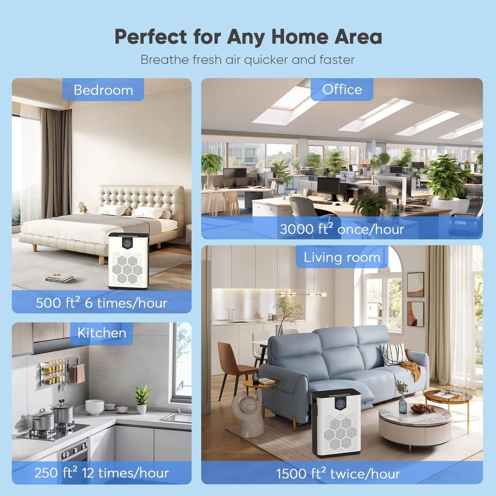 γπππππππ π πππππ πππ π πππ πππππ πππππππππππ πππππγFirst Line of Defense: The removable and washable fine-mesh pre-filter effectively captures pet hair, dander, fibers, and larger debris, significantly reducing the frequency of replacing the True HEPA14 filter. Simple Cleaning: Just wash or vacuum the pre-filter to save over $30 per cleaning and prolong the life of your main filter.Healthy Home: air purifier ensures fresh, clean air while keeping your filter replacement costs low γπ π± ππππππππ πππ ππππ π πππππγDiscover exceptional air quality with our new air purifiers for home, featuring two advanced H14 HEPA filters that capture 99.997% of particles as small as 0.1 micronsβsuperior to H13 filter. Our Hepa air purifier combines a pre-filter, H14 HEPA filter, activated carbon filter, and net filter to achieve optimal performance. Efficiently removes dust, smoke, pollen, pet hair, and odors, ensuring you breathe easier and enjoy a fresher, cleaner home environment γππππππ ππππ πππππππππ ππ ππ πππππ πΒ²γOur air purifier stands out with its innovative dual-sided air intake system, providing faster air circulation and purifying up to 3,000 sq. ft. per hour in turbo mode. Featuring two H14 HEPA filters, this air purifiers for home large room offer significantly cleaning performance. Whether you're relaxing in the bedroom, entertaining in the living room, cooking in the kitchen, or working in the office, you can immediately experience fresher, cleaner air γπππππ πππ, ππππ πππππγEquipped with multiple modes and 5 fan speeds, our air purifiers for home pets with auto mode will automatically adjust the fan speed according to the air quality and intelligently purify the air. In sleep mode, the fan operates at a whisper-quiet 22 dB, providing a tranquil and deep sleep environment even for light sleepers. Customize your sleep time by setting the timer for 2, 4, 6, or 8 hours. the considerate child lock design prevents accidental touches and ensures the safety of your children and pets γπππππππ ππππππ ππππ ππππππππππ ππππππ πππγExperience advanced air quality monitoring with our air purifiers for bedroom. Equipped with a built-in PM2.5 smart detector, this purifier offers both color-coded and numerical displays for real-time air quality updates. The color indicators provide an easy-to-understand visual guide: red for poor, orange for moderate, green for good, and blue for excellent air quality γππππ ππππππππ & πππππππππππγThis AP303 home air purifiers have passed FCC certified, ETL Listed, CARB approved and 100% OZONE FREE. Only use replacement filters for best results and product performance. We recommend replacing the air filter every 4-6 months to ensure optimal air purification. Also it has a variety of replacement filters to meet your needs, Toxin Absorber Filter, Smoke Remover Filter, Original Filter, Pet Filter