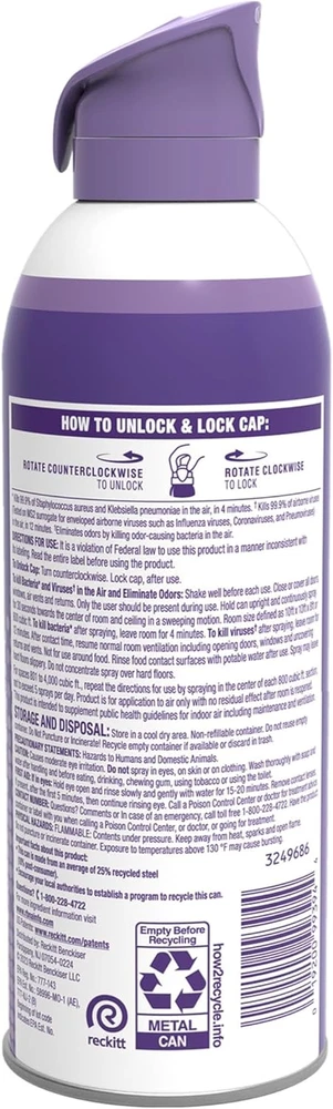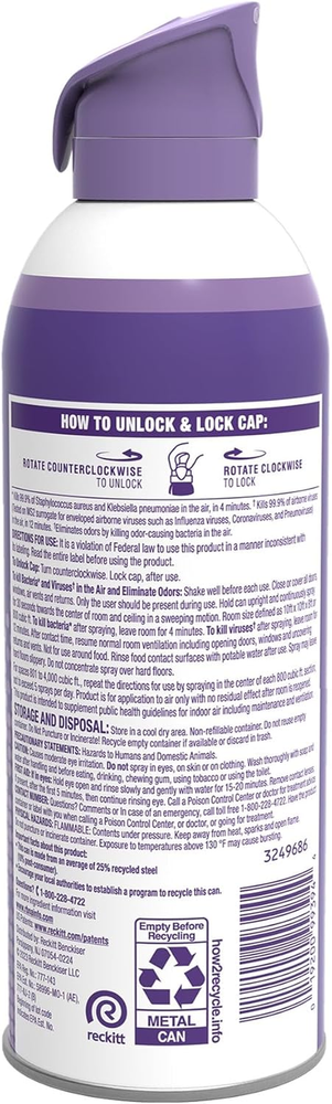 ELMINATES 99.9% OF VIRUSES AND BACTERIA IN THE AIR: Air Sanitizer Spray is tested and proven to eliminate 99.9% of viruses and bacteria* in the air. (*Use as directed); EPA Reg No. 777-143. SANITIZE THE AIR THROUGHOUT YOUR HOME: Air Sanitizer Spray sanitizes and eliminates 99.9% of odor causing bacteria* in the air. Enjoy the light breeze scent. (*Use as directed). HELP PROTECT FROM AIRBORNE PATHOGENS: Add Air Sanitizer Spray to your cleaning routine to eliminate 99.9% of viruses and bacteria* in the air and help protect your family. (*Use as directed). ELIMINATES ODORS*: Bad smells can be caused by odor causing bacteria. Use Air Sanitizer Spray to eliminate 99.9% of viruses and bacteria* in the air. (*Use as directed). A LEADER IN DISINFECTION: Looking for some of our great household disinfectant cleaning products. Try Disinfectant Cleaning Wipes, All Purpose Cleaners, and Bathroom Cleaners (packaging may vary). Air Sanitizer Spray is the first EPA registered air sanitizer (EPA Reg No 777-143) to eliminate both viruses and bacteria* in the air. Use this spray to help protect your family from the spread of airborne pathogens in the air. Air Sanitizer Spray is tested and proven to eliminate 99.9% of viruses and bacteria* in the air. Air Sanitizer Spray is easy to add into your cleaning routine, use it to sanitize the air throughout your home and eliminate odors by killing odor-causing bacteria in the air. (*When used as directed).