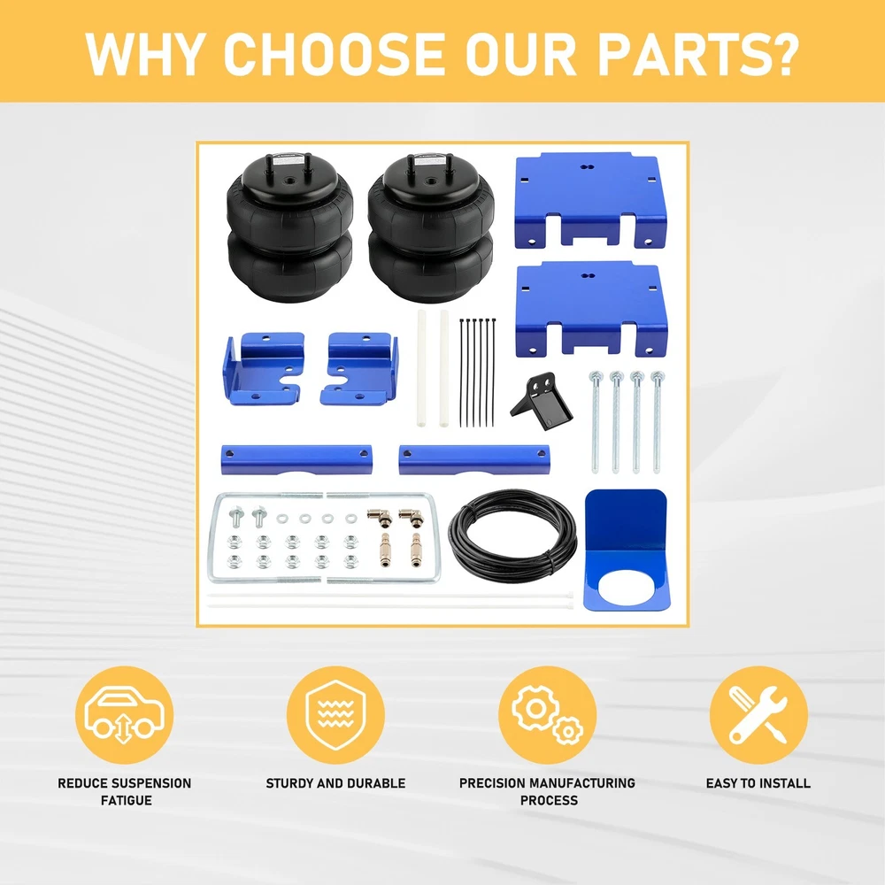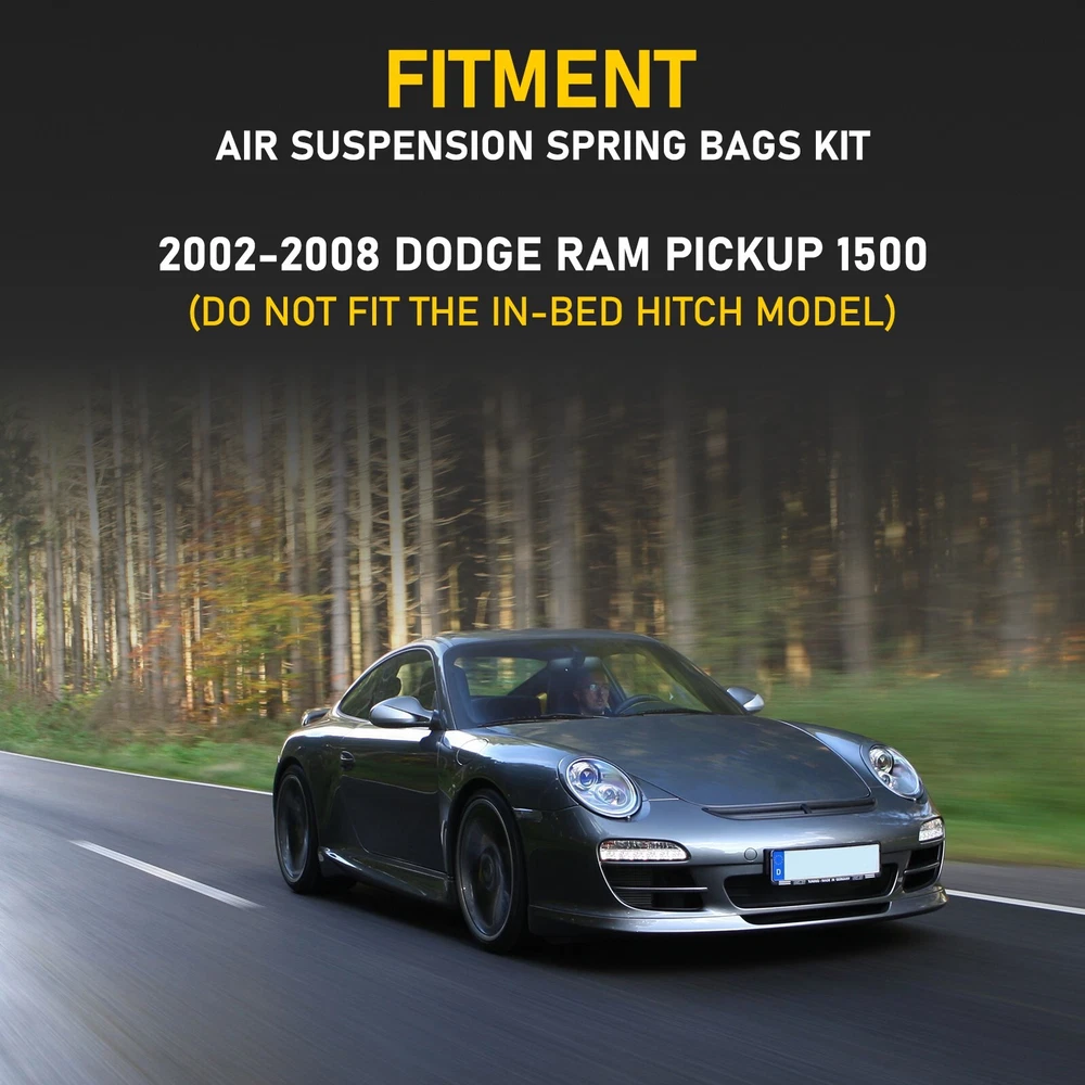 eBay Air Spring Suspension Bags Kit for For Dodge Ram Pickup 1500 2WD 4WD 2002-2008 FEATURE Condition: Brand New Fully adjustable air springs to level your vehicle when towing or hauling a heavy load for a safe comfortable ride. Up to 5,000 pounds of load capability. Exclusive internal jounce bumper inside, springs absorb shock. Removing the jounce bumper before installation. Instructions Are Not Included, professional Installation is highly recommed. Package 2 x Air Springs, Air Lines, Schrader Valve, Mounting Bracket, Hardware. ( As pictures show ) Compatibility For Dodge Ram Pickup 1500 2WD/4WD 2002-2008 Returns and Exchanges Please Do Not click "Return this item" in any situation. Because sometimes it will spend more time to resolve the issue,pls contact us via ebay message that is the fastest way to solve any problem for you; All NON-Seller Mistake returns for refund are subject to 20% re-stocking fee and buyer should pay for the return shipping fee and handle fee.(For example,you brought wrong item or cancelled order after item was shipped); All return products should be in brand new state with all accessories included; Note: No returns or exchanges once product has been installed on the vehicle. Shipment We will ship all orders asap. from Texas via USPS or UPS.( No service on Weekend and public holidays); No pick-up service. Warranty and Feedback Customer satisfaction is very important to us and our feedback rating reflects this satisfaction. If you have any question or concern, please contact us via ebay message; We fully guarantee customers an exchange or refund within 30 business days of receipt if item DOA (damage on arrival); Warranty excludes normal product lifetime wear-out, wear and tear or abuse; Warranty does not apply to conditions resulting from misuse, abuse, negligence, accident, improper application, improper installation or alteration; For malfunction products under warranty period,please contact our customer service via EBay Message.