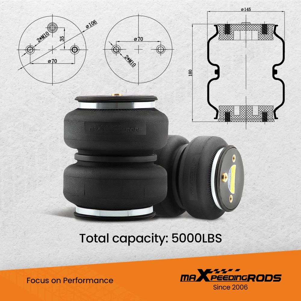 YRMAP Air Spring Suspension Kit For Ford F250 F350 Super Duty Pickup 2005-2010 Air Suspension Bags Kit maXpeedingrods Air Suspension Bags Kit Fitment For Ford F-250 SUPER DUTY PICKUP KING RANCH RWD/4WD 2005-2010 For Ford F-250 SUPER DUTY PICKUP KING LARIAT RWD/4WD 2005-2010 For Ford F-250 SUPER DUTY PICKUP KING XL RWD/4WD 2005-2010 For Ford F-250 SUPER DUTY PICKUP KING XLT RWD/4WD 2005-2010 For Ford F-350 SUPER DUTY PICKUP KING RANCH RWD/4WD 2005-2010 For Ford F-350 SUPER DUTY PICKUP KING LARIAT RWD/4WD 2005-2010 For Ford F-350 SUPER DUTY PICKUP KING XL RWD/4WD 2005-2010 For Ford F-350 SUPER DUTY PICKUP KING XLT RWD/4WD 2005-2010 For Ford F-250 SUPER DUTY PICKUP CABELAS 2009-2010 For Ford F-250 SUPER DUTY PICKUP FX4 2008-2009 For Ford F-250 SUPER DUTY PICKUP HARLEY-DAVIDSON EDITION 2005-2010 For Ford F-350 SUPER DUTY PICKUP CABELAS 2009-2010 For Ford F-350 SUPER DUTY PICKUP FX4 2008-2009 For Ford F-350 SUPER DUTY PICKUP HARLEY-DAVIDSON EDITION 2005-2010 Notice:Only fit for no bed hitch and some 5th wheel hitch model Package Includes 4x Upper and lower mounting brackets 4x Rolling plates Includes All Brackets & Hardware Needed to Install Features Restore the original ride height and improve ride quality Specifications Condition Brand New Internal Jounce Bumper include Yes Stroke 100 mm Placement on Vehicle Rear left and right Load capacity Up to 5000 LBS Minimum PSI 5 PSI Maximum PSI 100PSI Max. Extended 200mm Min. Compressed 100mm Features 1、Stress Test Over 5,000,000 Times:Durable and Safe 2、Burst Pressure≥2.0MPa:High Compressive Strength and Less Noise 3、24 Hours Air Tightness Test ≤ 0.02MPa:100% Air Tightness Guarantee 4、Temperature Range ≥ -40℃/ ≤ 70℃:Premium Natural Rubber Material 5、Use high-quality steel with high load-bearing capacity and long life. 6、Excellent and practical bolt-on installation. 7、Safe carrying capacity and stability 8、Restore the original ride height and improve ride quality 9、Ensure our driving comfort and reduce tire wear. maXpeedingrods Air Suspension Bags Kit Solves These Common Problems Other items you might also like Air Suspension Spring Bag Kit For GMC Silverado Sierra 1500 4WD 2019-24 Rear Air Suspension Spring Bag Kit 5000lbs For Dodge Ram 2500 3500 2003-2018 4WD Air Suspension Spring Kit 5000 lbs For GMC Sierra Chevrolet Silverado 1500 99-07 2x Cab Air Suspension Spring Bags for Peterbilt 379 W02-358-7036 29-03200 Rear Air Helper Spring Leveling Kit For Ford F250 F350 Super Duty 2005-2010 Air Suspension Spring Kit 5000lbs For Dodge Ram 1500 4 Wheel Drive 2019-24 Air Suspension Spring Kit For GMC Sierra 1500 Chevrolet 1500 4WD 2019-2024 Rear Air Spring Leveling Kit for Ford F250 F350 Super Duty Pickup 4WD RWD 99-07 Pair Rear Air Ride Suspension Shock for Chevrolet GMC Cadillac Escalade 25979393 Air Spring Bag Tow Assist Rear 5000lbs For GMC Sierra Chevrolet 1500 2007-2018 Air Suspension Spring Bag Kit Rear For F250 F350 Super Duty 2WD 4WD 2011-2016 Air Suspension Bag Kit 7500 lbs For Ford F250 F350 F450 Super Duty 4WD 2017-22 Shipping Terms of Sales Payment Contact us All orders will be shipped within 1 business day after payment has been processed. For orders placed before 5:30 AM PST on business days, most items will be shipped out on the same day. All orders will be shipped with a tracking number via USPS, UPS, or FedEx Express and delivered within 2-6 business days We do not ship to P.O. Boxes, APO/FPO addresses, or Military Mail Boxes. Please ensure your address is confirmed by PayPal before checkout, as we only ship to confirmed addresses. 30-day free return and money back guarantee If you are not satisfied with your purchase, you can return the item with its original packaging to us for a full refund with no restocking fee. Please note that the return cost should be paid by the seller. One Year Unlimited Mileage Quality Guarantee If you receive incorrect items, items that are damaged during transportation, or defective items, we will accept returns and cover the return freight. Please note that the return cost should be prepaid by the buyer. After inspecting the faulty item, we will issue a refund of the return cost to the buyer. We offer a full refund or replacement for all faulty items, which includes the cost of original shipping. Please contact us before initiating a return. Our representatives will provide you with detailed instructions on how to proceed. Our guarantee covers only the cost of the item. We are not responsible for installation or other fees, such as labor, towing, additional repairs, or related expenses. We only accept payment through Paypal for all orders, which should be made through eBay. Paypal offers various payment methods, including credit card, direct debit, VISA, and others. For more information, please visit Paypal. Our customer service center is open 24 hours a day, seven days a week. If you have any questions, please don't hesitate to contact us. We are dedicated to providing excellent customer service and will do everything we can to ensure your satisfaction.