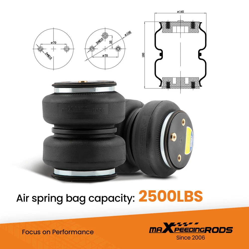 YRMAP Air Suspension Spring Kit 5000lbs For Dodge Ram 1500 4 Wheel Drive 2019-24 Air Suspension Bags Kit maXpeedingrods Air Suspension Bags Kit Fitment for Ram 1500 STANDARD 4WD 2019-2024 for Dodge Ram 1500 STANDARD 4WD 2019-2024 Note : Does not fit 2019 Classic model. DOES NOT FIT TRX. Package Includes 2x Heavy Duty Double Bellow Air Ride Suspension bags 6x Upper and lower mounting brackets Includes All Brackets & Hardware Needed to Install Features Restore the original ride height and improve ride quality Specifications Condition Brand New Internal Jounce Bumper include Yes Stroke 100mm Placement on Vehicle Rear left and right Load capacity Up to 5000 LBS Minimum PSI 5 PSI Maximum PSI 100PSI Max. Extended 200mm Min. Compressed 100mm Features 1、Stress Test Over 5,000,000 Times:Durable and Safe 2、Burst Pressure≥2.0MPa:High Compressive Strength and Less Noise 3、24 Hours Air Tightness Test ≤ 0.02MPa:100% Air Tightness Guarantee 4、Temperature Range ≥ -40℃/ ≤ 70℃:Premium Natural Rubber Material 5、Use high-quality steel with high load-bearing capacity and long life. 6、Excellent and practical bolt-on installation. 7、Safe carrying capacity and stability 8、Restore the original ride height and improve ride quality 9、Ensure our driving comfort and reduce tire wear. maXpeedingrods Air Suspension Bags Kit Solves These Common Problems Why Choose MaXpeedingrods? Fatigue Testing Airtightness Test Air Pressure Test Trusted by Champions On Board Air Compressor Kit See Details Make Universal for most air bags suspension kit Example 1 For Ford Example 2 For GMV Example 3 For Dodge Example 4 For Chevy Other items you might also like Rear Air Suspension Spring Bag Kit 5000lbs For Dodge Ram 2500 3500 2003-2018 4WD Air Suspension Spring Bag Kit For GMC Silverado Sierra 1500 4WD 2019-24 Air Suspension Spring Kit 5000 lbs For GMC Sierra Chevrolet Silverado 1500 99-07 Pair Rear Air Ride Suspension Shock for Chevrolet GMC Cadillac Escalade 25979393 2x Cab Air Suspension Spring Bags for Peterbilt 379 W02-358-7036 29-03200 Rear Air Helper Spring Leveling Kit For Ford F250 F350 Super Duty 2005-2010 Air Spring Bag Tow Assist Rear 5000lbs For GMC Sierra Chevrolet 1500 2007-2018 Air Suspension Spring Kit For GMC Sierra 1500 Chevrolet 1500 4WD 2019-2024 Rear Air Spring Leveling Kit for Ford F250 F350 Super Duty Pickup 4WD RWD 99-07 Air Suspension Spring Bag Kit Rear For F250 F350 Super Duty 2WD 4WD 2011-2016 Air Suspension Bag Kit 7500 lbs For Ford F250 F350 F450 Super Duty 4WD 2017-22 Rear Air Spring Kit Bags Air lines For Silverado 2500HD 3500HD 2WD 4WD 2001-2010 Shipping Terms of Sales Payment Contact us All orders will be shipped within 1 business day after payment has been processed. For orders placed before 5:30 AM PST on business days, most items will be shipped out on the same day. All orders will be shipped with a tracking number via USPS, UPS, or FedEx Express and delivered within 2-6 business days We do not ship to P.O. Boxes, APO/FPO addresses, or Military Mail Boxes. Please ensure your address is confirmed by PayPal before checkout, as we only ship to confirmed addresses. 30-day free return and money back guarantee If you are not satisfied with your purchase, you can return the item with its original packaging to us for a full refund with no restocking fee. Please note that the return cost should be paid by the seller. One Year Unlimited Mileage Quality Guarantee If you receive incorrect items, items that are damaged during transportation, or defective items, we will accept returns and cover the return freight. Please note that the return cost should be prepaid by the buyer. After inspecting the faulty item, we will issue a refund of the return cost to the buyer. We offer a full refund or replacement for all faulty items, which includes the cost of original shipping. Please contact us before initiating a return. Our representatives will provide you with detailed instructions on how to proceed. Our guarantee covers only the cost of the item. We are not responsible for installation or other fees, such as labor, towing, additional repairs, or related expenses. We only accept payment through Paypal for all orders, which should be made through eBay. Paypal offers various payment methods, including credit card, direct debit, VISA, and others. For more information, please visit Paypal. Our customer service center is open 24 hours a day, seven days a week. If you have any questions, please don't hesitate to contact us. We are dedicated to providing excellent customer service and will do everything we can to ensure your satisfaction.