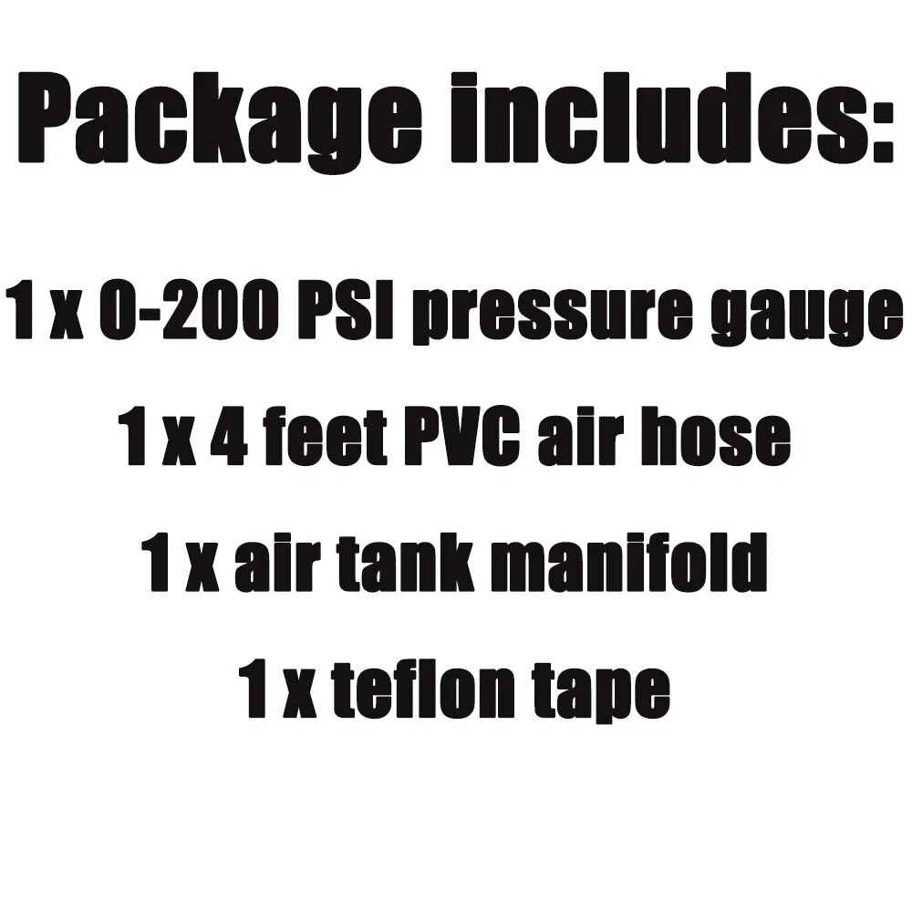 Product Description If there are any problems after you purchased, please feel free to message us firstly, we will definitely give you a satisfying solution. Please don't leave neutral or negative feedback or open a return request without any communication. Before you buy, check the size to make sure it can fit your car,thanks Features: Air Tank Valve Kit with Gauge Air Tank Repair Kit The tank end is 1/2" MNPT. The gauge port is 1/8" FNPT. The outlet (hose) port is 1/4" FNPT. The air tank pressure gauge range from 0-200 PSI/0-14Bar The air hose length is 4feet/48inch built with a 2" dual scale dial With an aluminum on/off knob, to comply with air tank use. Great choice for the air tank repair kit Specification: 100% BrandNew Material: Brass & Steel & PVC Color:As pictures shown Package includes: 1 x 0-200 PSI pressure gauge 1 x 4 feet PVC air hose 1 x air tank manifold 1 x teflon tape Shipping 1. Items will be shipped within two business days when we received payment. There will be delay when it meets weekend and majoy hoildays, hope you can wait patiently.thanks. 2.The item will be shipped to buyer’s CORRECT and VERIFIED Ebay Address. 3.We are not responsible for the package lost due to incorrect address. 4. International buyers please note: a.Import duties, taxes and charges are not included in the item price or shipping charges. These charges are buyer’s responsibility. We will try our best to reduce the risk of the custom duties. Returns ▲▲▲ Please contact us first before you sent a return request ▲▲▲ Any problems you meet, we will help to solve it,We will ensure that customers do not suffer losses, please don't worry.Trust us!!! 1) No NEED TO RETURN . If you received an incorrect, damaged, defective, or item not as described, Just Contact us directly by ebay messages,send us the photos, videos, we will give you the partial or full refund or replacement on our cost. 2) If you sent a return request ,please selete the reason for return: Changed my mind/Just didn't like it/Order by mistake .Thanks for your cooperation. Return products must also be in its original condition: including box, packaging and all other accessories. Please email us your return tracking number too,thanks. Payment 1. Instant PayPal payment is required. 2. We also accepts Visa, MasterCard, Discover, and American Express through PayPal guest checkout. 3. Sales tax is charged by eBay based on your shipping address. 4. To uphold a shipping speed, your order will be processed almost immediately. If you change your mind after your payment is confirmed, we will do our best to stop the order, however, we CANNOT guarantee the cancellation. Contact US 1. We work 5 days (Mon to Friday) a week . If you have any questions please contact us by email, most emails are responded within 24 business hours. Weekend and Holodays will be delay, please give us some time and tell us your problem clearly ( including photos or videos will be better ), we will and we can fix it faster. 2. We strive for 100% customer satisfaction on every sale we complete. 3. If, for any reason you are not satisfied with your purchase, please contact us before leaving neutral or negative feedback. We will work with you. 4. Please send email directly or try send email by other account. The feedback forum is not the place to leave us a message. Feedback 1.Dear buyers, we appreciate your business, if you are satisfied with our service, Please leave us a positive feedback and rate the details of the transaction (Detailed Seller Ratings) with a " PERFECT 5 Star. 2.Your recognition will make us more confident to develop business and serve you better. 3.Our goal is to make sure you are a happy buyer and pleasant shopping with us. Please email us before leaving any 1 or 2 ratings, negative feedback or open any dispute.We understand the concerns and frustrations you might have, and will do our endeavor to resolve the issues.Please give us the opportunity to resolve any problem. powered by