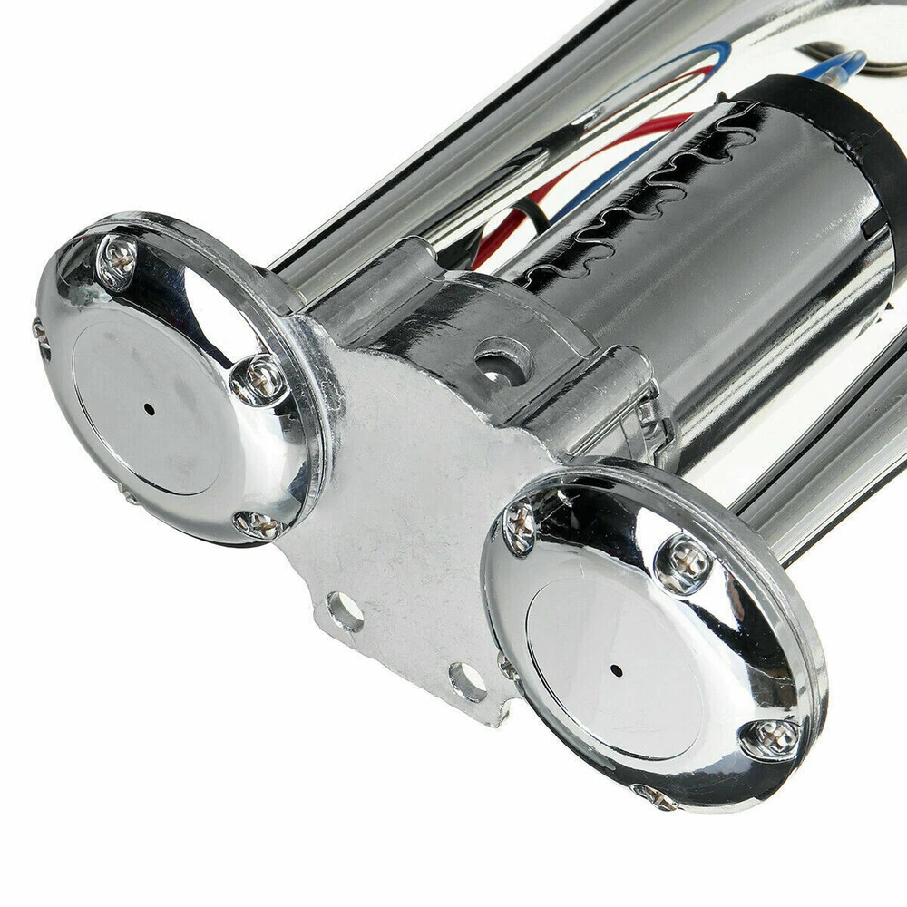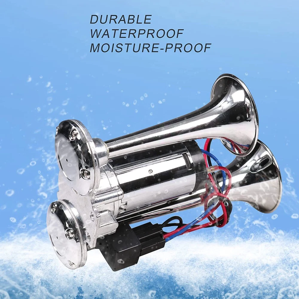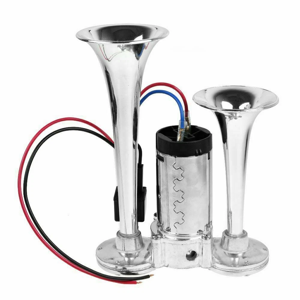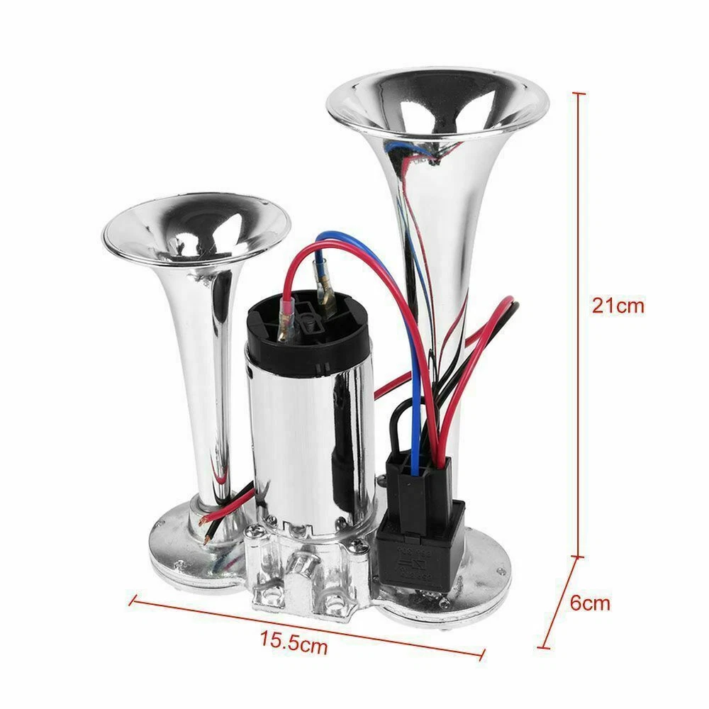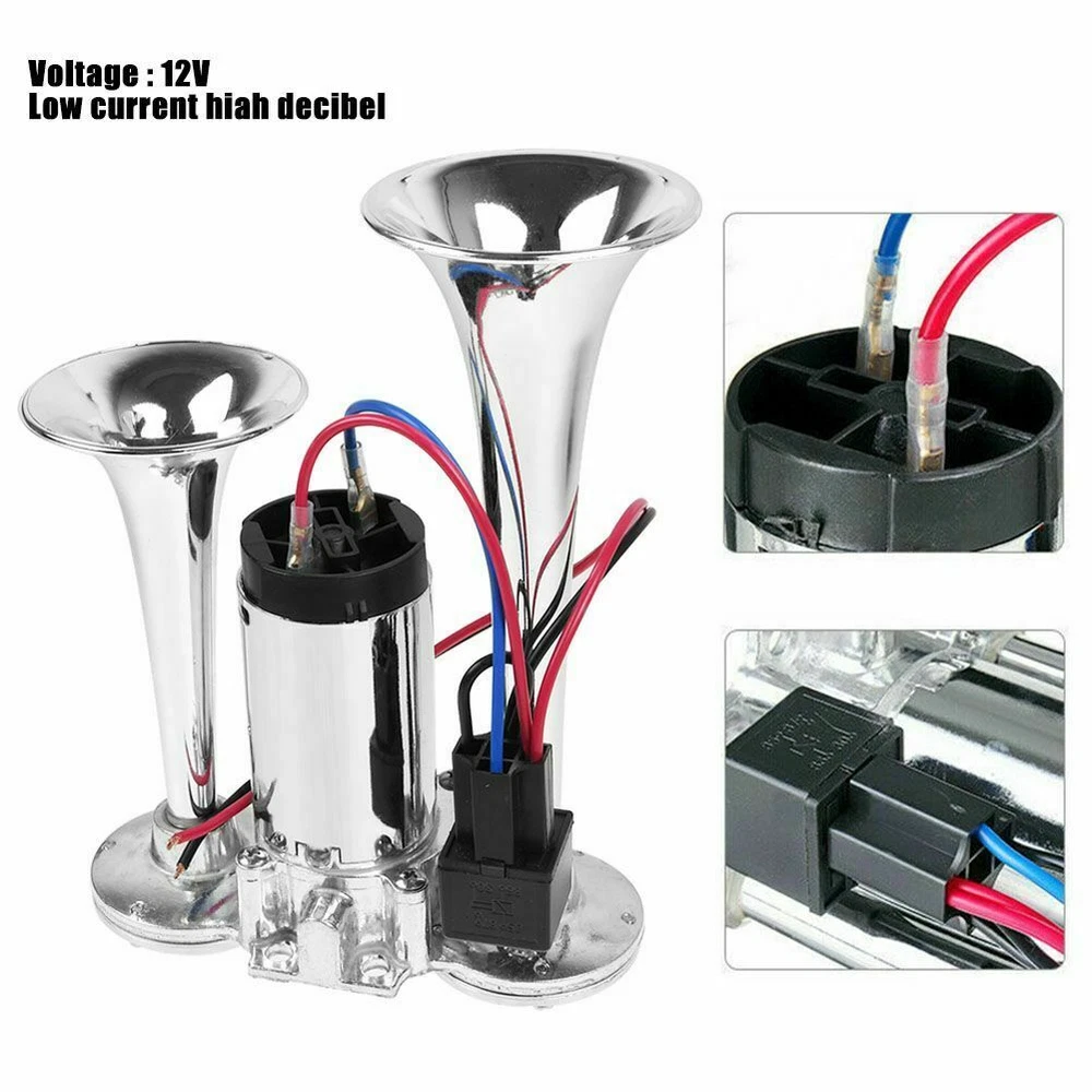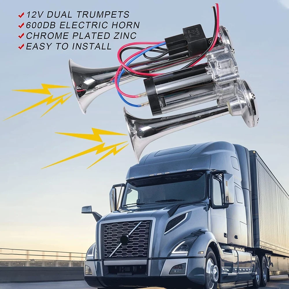 Product Description: Feature : 👉 The upgraded air compressor and larger coil can be made into stronger air pressure, which promotes louder and clearer sound from the horn. 👉 Compatible with 12V system, can be used for SUV, motorcycle, yacht, ship, off-road vehicle, bus, train, etc. 👉 High-quality chromium-plated zinc-aluminum alloy material, hard, durable, wear-resistant, corrosion-resistant, and has a long service life. 👉 The double-tube horn is specially designed for customers looking for a loud and affordable air horn, with a sound level of 600dB, stable performance and higher work efficiency. 👉 Easy to install: Our speaker kit is very easy to install, you only need to connect the wire on the straight screw terminal to the original speaker wire or the horn switch on the dashboard. It also comes with a universal mount to make installation easier. Specification: Color: Silver Material: High Quality Chrome Plated Sound level: 600DB Voltage: 12V Designed for any 12 volt DC: Suitable for cars, boats, trains, trucks, engineering vehicles, etc. Packing list: 1 x Dual Trumpet Electric Horn 1 x Set of Installation Hardware The upgraded air compressor and larger coil can be made into stronger air pressure, which promotes louder and clearer sound from the horn. High-quality chromium-plated zinc-aluminum alloy material, hard, durable, wear-resistant, corrosion-resistant, and has a long service life. Easy to install: Our speaker kit is very easy to install, you only need to connect the wire on the straight screw terminal to the original speaker wire or the horn switch on the dashboard. It also comes with a universal mount to make installation easier.