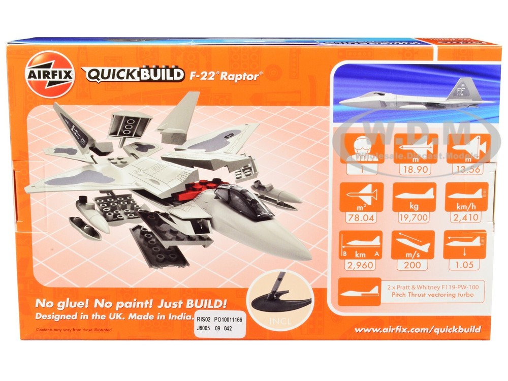 SAVE WHEN BUYING MORE!!! Buy as many items as you wish and we will ship them for one low shipping cost to 48 continental U.S. states physical addresses. Example: Shipping cost for most 1/24 scale items is $10, for 1/18 scale items is $12. If you use Add to cart button and purchase 5 items in 1/24 scale and 5 items in 1/18 scale, your shipping cost will be only $12 for 10 items. In order to request combined shipping for signed in desktop users: Please use Add to cart button for desired items, click Go to cart button and press Request total from us before paying and we will send combined shipping invoice shortly. If checking out as a Guest or using a mobile version, please use Add to cart button then click Go to cart button , press Go to checkout button, request extra shipping refund in Message to seller section and finalize payment by pressing Confirm and pay button. We will refund extra shipping cost shortly. DESCRIPTION: Brand new F22 Raptor Snap Together (Skill 1) Painted Plastic Model Airplane Kit by Airfix Quickbuild. Brand new box. Includes 24 parts. Highly detailed model kit. Detailed interior, exterior. Officially licensed product. Self-adhesive stickers are included. A plastic display stand is included. This item does not have openings. No glue or paint is required. Just build. Approximate dimensions: Length-8.2, Width-6 inches. ABOUT: Airfix QUICK BUILD is an exciting range of brick-based models suitable as an introduction to modeling for any age of 6 and up. The pre-colored pieces simply push together to build an impressive model which can then be decorated with the included self-adhesive stickers. No paint or glue is needed to make these fantastic models look like the real thing, and once completed there's no evidence of any of the brick fittings showing. When built they are tough enough to be used as toys, or smart enough to use as display models. Either will show off those great modeling skills! Included with each model are a full set of easy-to-follow color instructions, free-rolling wheels for cars and tanks, and display stands for all aircraft. PAYMENT INSTRUCTIONS: We gladly accept paypal. Tracking info is free upon request. SHIPPING INFO: We do combine shipping cost for two or more items purchased. Please check shipping and payment section. In order to receive combined invoice for multiple purchases, please purchase items and let us know when you are done shopping, so we can send you one combined invoice. We can only combine shipping cost if items paid in one transaction. Dear Valued Customer! We appreciate your business. BUY WITH CONFIDENCE Fast Order Fulfillment 99% of orders are shipped within 24 hours or sooner. Simple Return Policy Thirty days simple returns. More than 10 Years of Experience Family owned and operated, we’ve had the experience of selling online for more than 10 years. Satisfaction Guaranteed! Our feedback says it all. And now, we hope to have the chance to prove we are the best to you! Competitive Pricing and Unrivaled Selection We are the number one direct distributor of diecast model cars in the USA, so we are able to provide very competitive pricing. Our stock selection is unrivaled with over 4,500 different items. Quality Shipping & Handling We package all our orders with care using bubble wrap to protect models from damage in transit. Each model that has a fragile window box is covered with carton protection. Excellent Customer Service Our customer service is second to none with thousands of returning, satisfied customers from all over the world.