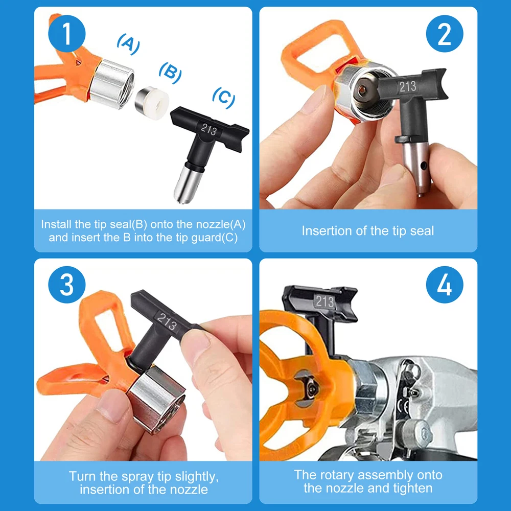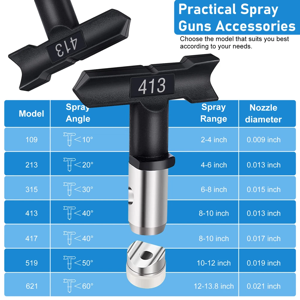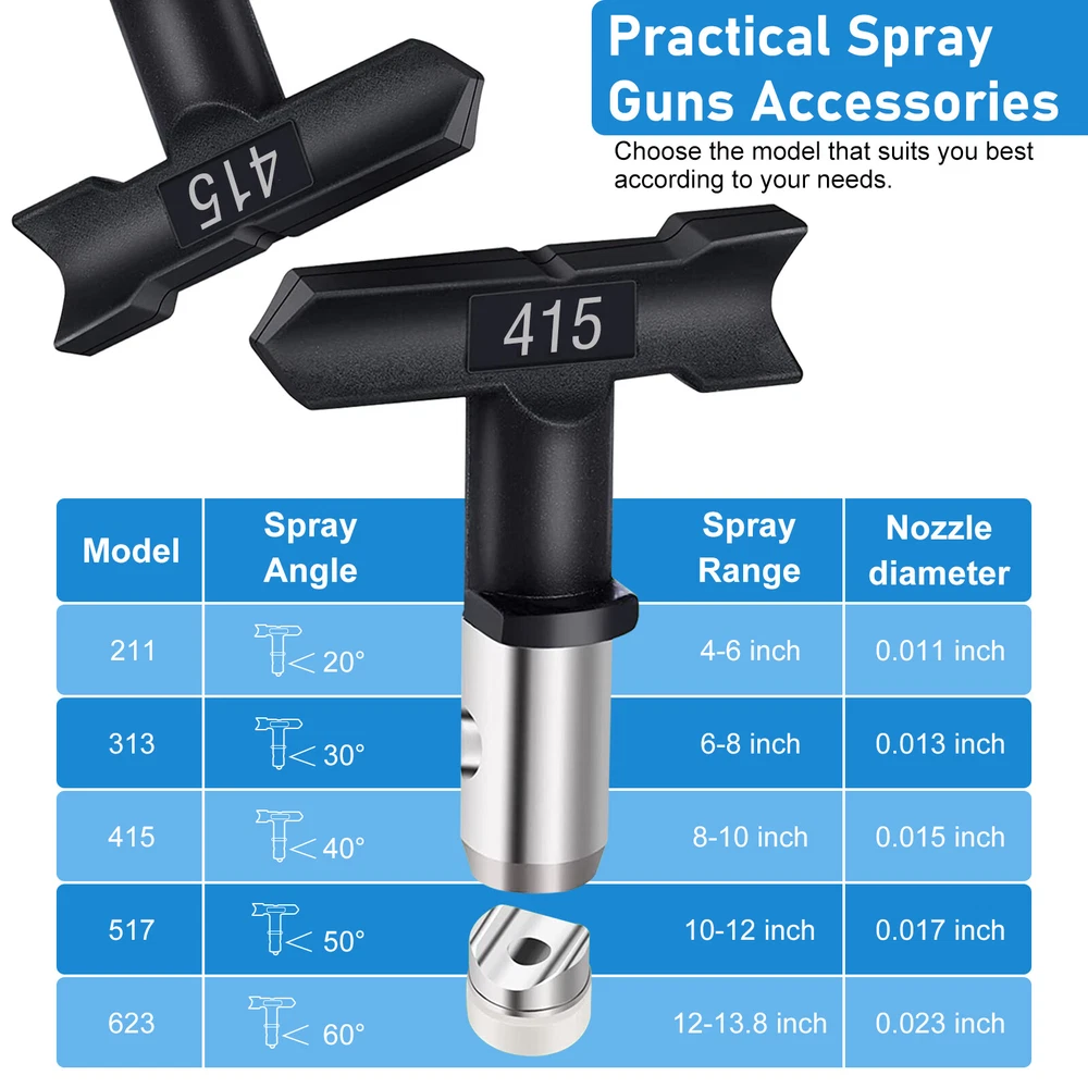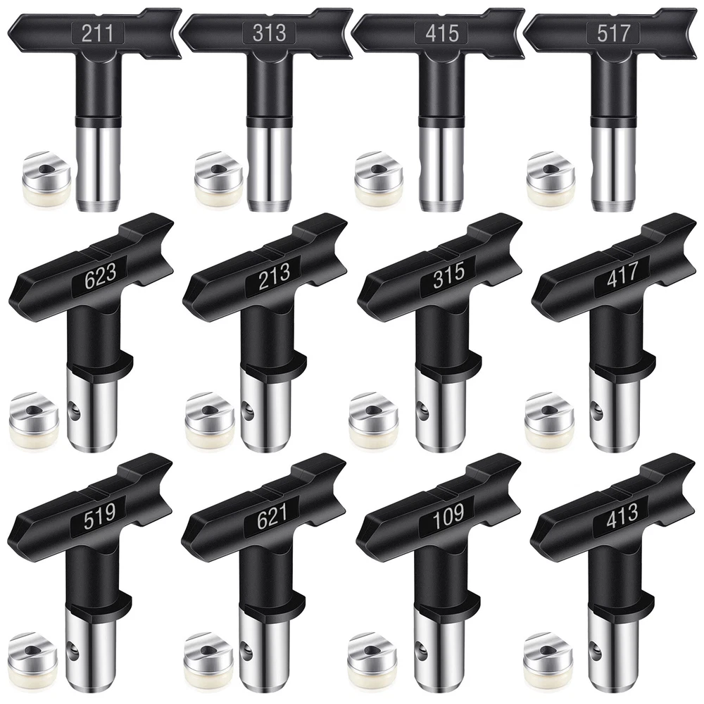 Product Description Features: -【Wide compatibility】 Available in #211, #313, #415, #517, #623, #213, #315, #417, #519, #621, #109, #413, airless sprayer nozzles compatible with most airless sprayers; The spray range will vary depending on the size of the aperture and is perfectly suited to your daily use and replacement needs -【Quality material】 Double-sided airless nozzle made of tungsten steel, strong and wear-resistant, easy to clean, long service life -【Easy installation】 No installation tools, just a few steps to install the airless nozzle on the sprayer; First use the nozzle to seal the nozzle in the protection seat, and then insert the nozzle into the protection seat to rotate to complete the installation, saving time and effort for your project -【Feature HEA Technology】 Nozzles reduce overspraying by up to 55% while providing softer spraying, improved control, and a more consistent finish. Save more paint. Suitable for paint, furniture, fence, home decoration, industrial fine drawing decoration, etc -【 Practical design 】 Airless sprayer nozzle has reverse airless cleaning switch nozzle design, spray can be quickly cleaned in reversible position, prevent nozzle clogging, practical and effective for your work Specifications: - Material: Stainless steel + Tungsten steel - Color: Black - Model compatibility: #211, #313, #415, #517, #623, #213, #315, #417, #519, #621, #109, #413 Package included: 1x Nozzle