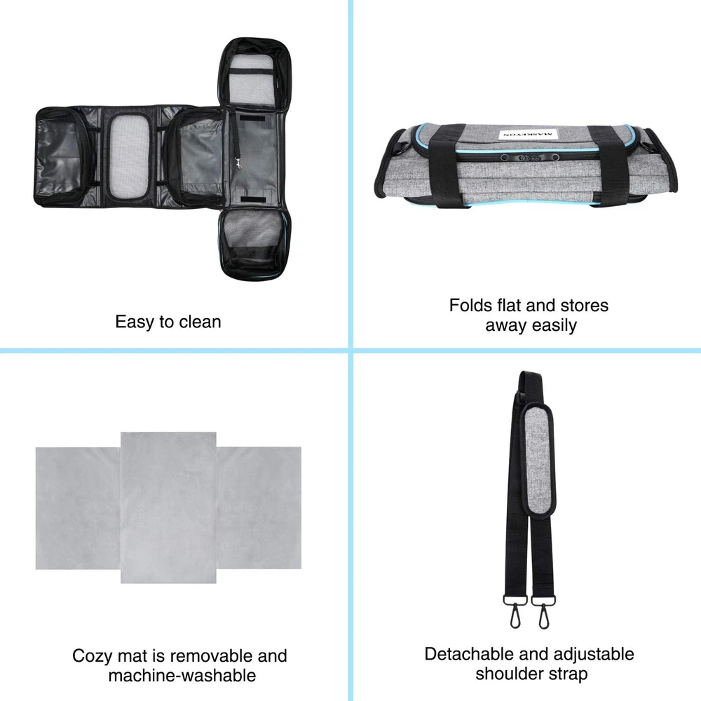 Please measure your pet before purchasing: 19.5"L x 12"W x 12"H(43.5"L x 32"W x 12"H after the 4 expandable soft sided).Max load of 20 lbs (9 kg). Fits Pets up to 19"Lx11"H x 11"H. Easy to clean: for the cozy mat, it is detachable and machine-washed.For the pet carrier, just unzip it and easy to clean the inner and outer layers. Pet-friendly design: We increased the top ventilated opening, which make it more convinient to put your cat dog in or out without getting hurt.To increase the stability of the carrier, we added steel strand into the frame. no defrmation and no sag. In addition to the topping way, it has 2 side entrances,easy to access. Multifunctional Carrier: 2 front pockets + 1 sided mesh pocket,will help you to organize small accessies,Pet food,pet toy,container of treats,snacks,calming collars,Pads etc.4 way expansions providing more room for your pets to move around. The mesh extensions give your cat dog a better vision and airflow. Easy to carry: The detachable and adjustable shoulder strap and top handles for either way you'd like to carry them,or slide over luggage handle, or secure it in the car with seatbelt. 100% SATISFACTION GUARANTEED: We are sure that your pet will love our full-featured pet travel carrier.But if dont like it for any reason,you can return it freely and full refunded. Details of Maskeyon Airline Approved Pet Carrier: Fabric:Waterproof Cationic Oxford and High Density EVA board,it is non-toxic and odorless. Recommend Pets Weight: 20 lbs (about 9kg) Dimensions:19.5x12x12 inches (LxWxH) Color: Grey & Blue Zipper: metal slider,all zippers are anti-escape. storage pockets:2 front pockets+ 1 sided mesh pocket Name tag: put name in this tag for easy identificaiton to the vet Features: 1,top openning and 4 breathable soft-sided Extensions make it a good ventilation,and allow your pet to see outside much better.We increased the size of the top entry window for easier access. 2,Maskeyon pet carrier backpack has 3 entrances, easy to access. Unzip top entrance, pet can poke their head out 3,The mesh sides are strong! your cat dog will not be able to claw or chew her way out. 4,The fleece pad can be kept in place with velcro,and it would cover the 2 expanding foldouts, which makes your pet experience better 5,Non-slip bottom protector makes it safer when you put the carrier in a Smooth ground,such as under the airline seat 6,It's collapsible, unzip the zippers and fold it down into a flat package for easy storage 7,The Maskeyon pet carrier is lightweight but sturdy.Your puppy will keep calm down in our firm-bottomed carrier 8.This soft sided pet carrier bag is good for going to the vet or the car, travel,airplane ect. 9, TSA AIRLINE APPROVED: Designed to comply with TSA and IATA requirements. 10.Designed with reflective tapes on both sides, the mesh pet carrier is visible at night , increase safety of your pet during night trip. Package Contains: 1 x Maskeyon Pet Carrier 1 x Removable Soft Pad 1 x Removable Shoulder Strap