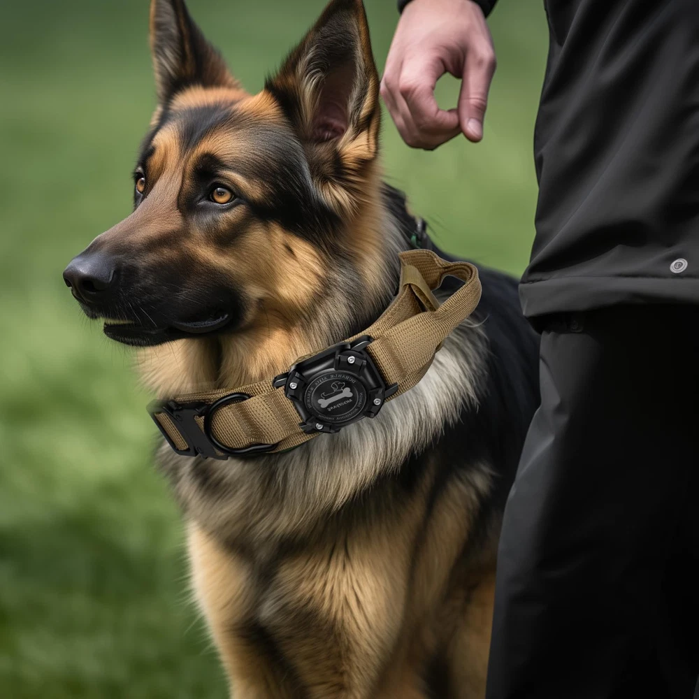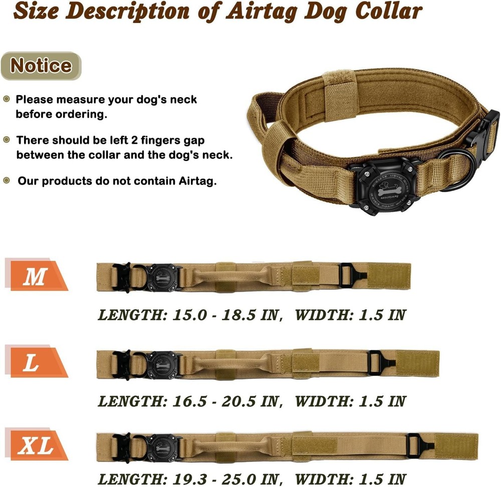 Integrated Design: The integrated airtag dog collar with holder is designed for the Apple AirTag. The integrated airtag holder is perfect for AirTags. It will effectively prevent the AirTag from dangling or falling off. (Note: AirTag is not included.) 100% Waterproof: This air tag dog collar holder is made of IP68 professional waterproof material. With fully sealed design and built-in waterproof ring, it is 100% waterproof and dustproof, protecting Airtag even when your dog is playing in the water, keep track of your furry friend worry-free. Comfortable & Durable: Our tactical dog collar made of premium 1000D nylon, with soft and breathable lining it is comfortable and will protect dog's neck well. Designed for medium to heavy duty large dogs, it is durable, wear-resisting and won't easily break. Control Handle: This military dog collar is equipped with a control handle. You can easily control your dog, when training, hunting, hiking, jogging, camping, running. Especially suitable for many medium and large dogs, like Alaskan Malamutes, German Shepherds, Dobermans, Border Collies, Labrador, Rottweilers, Great Danes, Golden Retrievers, Husky, etc. Double Security: The adjustable dog collar with metal buckle, which is used for adjusted size of collar to fit your dog. It is easy to be put on and taken off. The metal clasp can be released quickly in case of emergency.