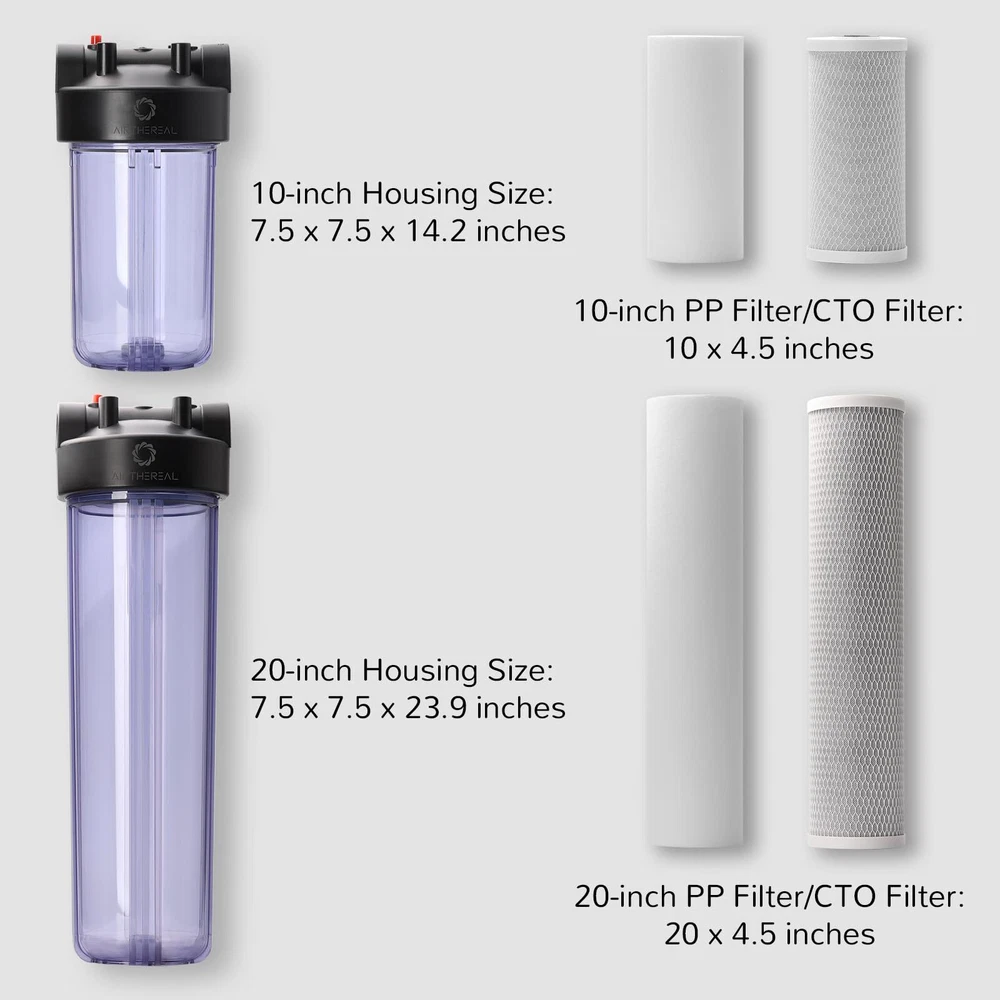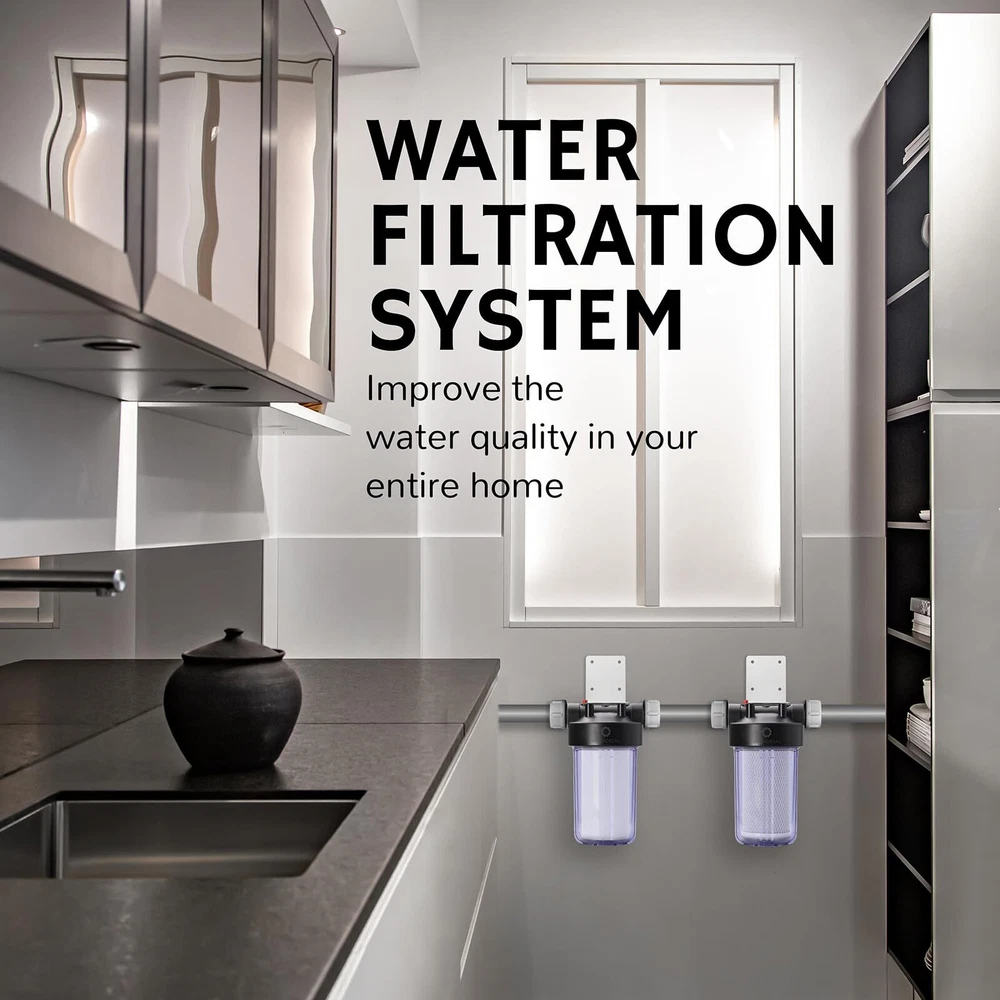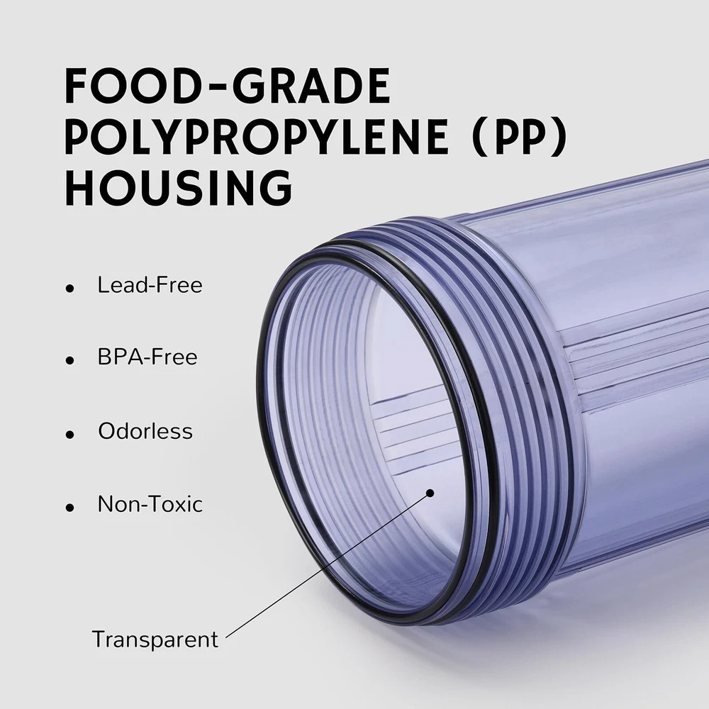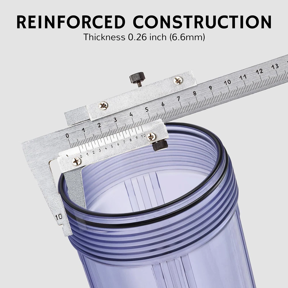 Transparent Monitoring: The transparent housing allows full visibility of the filter's status so you know when it needs to be cleaned or replaced. This feature enhances user convenience and ensures timely maintenance Simple Installation: The housing comes complete with all necessary tools for installation, including a wrench, heavy-duty steel mounting bracket, and screws. It features a standard 1" NPT inlet and outlet, fitting most water lines. Premium Construction: Crafted with premium quality to meet NSF standards, reinforced polypropylene housing ensures strength and chemical resistance to provide you with safe and healthy filtered water. Enhanced Leak Protection: Our 10" x 4.5" filter housing boasts an upgraded design with thickened ports made of brass and a double O-ring system. This ensures a secure and leak-free performance, addressing concerns about water leakage reported in other similar inline filter housings. Effortless Maintenance: Airthereal makes maintenance a breeze by providing a user-friendly design. The red pressure release button aids in simple filter replacements, ensuring a hassle-free experience for users.