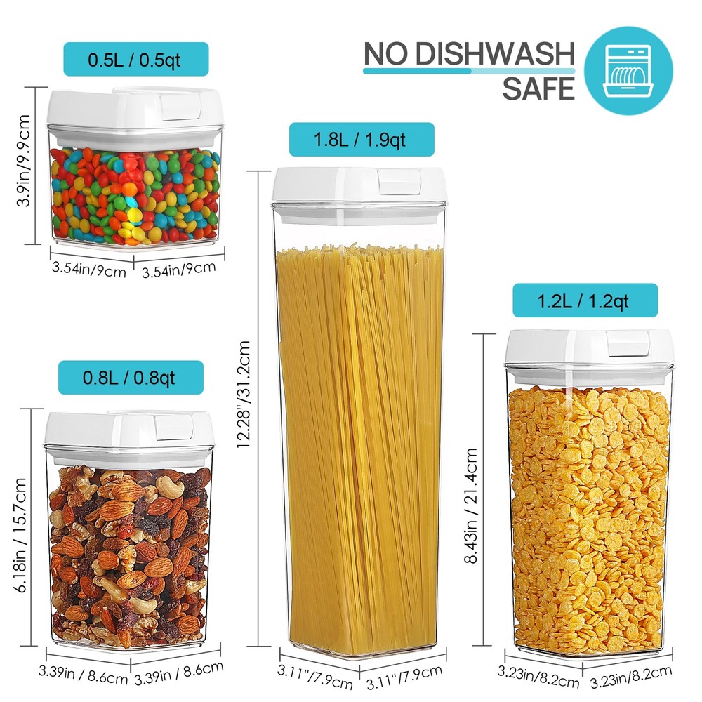 Vtopmart Airtight Food Storage Containers, 7 Pieces BPA Free Plastic Cereal Containers with Easy Lock Lids, for Kitchen Pantry Organization and Storage, Include 24 Labels, White Help Organize Your Kitchen and Pantry----Imagine waking up every morning and walking to the kitchen to make some breakfast, found everything is neatly organized. No longer messy, you can get everything you want very quickly. They will make you feel easy to organize the pantry. One Set Include 7 Pieces Containers----1 Tall Container (1.8L/1.9qt), 2 Medium Containers (1.2L/1.2qt ), 2 Small Containers (0.8L/0.8qt), 2 Mini Containers (0.5L/0.5qt). Perfect for storing flour, sugar, rice, grain, nuts, beans, snacks, pasta, coffee and tea! Clear containers allow you to identify contents----Made of high quality BPA free material, our air tight containers are durable and shatterproof. The plastic of these containers is very clear, you can identify the contents without opening them. Air-Tight to keep food dry and fresh----With special sealing mechanism, you can open or close our plastic containers safely by using only two fingers. Simply flip the ring to open or flip the ring down to lock and seal. 24 Reusable Labels ----These labels will help you never confuse flour with powdered sugar or baking powder with baking soda. They are reusable, you can switch contents whenever you need. TIPS--NOT DISHWASHER SAFE !!! Please don't use the dish-washing machine for cleaning the container, please wash the contanier by hand. Do you always feel hard to organize your pantry and kitchen? Why not choose our airtight food storage containers, they will make it easy for you to organize your pantry. 1. Made of durable plastic material, our flour storage container will be a great helper for you to organize your pantry. 2. The top is wide enough to take out food easily , you also can get your measuring cup or spoon in to measure. 3. Outside measurement markings make it much easier to know exactly how much food left and determine whether it requires replenishment. 4. With special design airtight lids, these plastic containers not only can keep your food fresh. Brand : Vtopmart Product Quality Grade : Food Grade Lid Material : Plastic + Silicone Container Material:Plastic Features : Recyclable / Healthy / BPA Free / Dishwasher Safe Color:White Lids +Clear Body Looking Package Include : 1 Tall Container (1.9 liters), 2 Medium Containers (1.2 liters), 2 Small Containers (0.8 liter), 2 Mini Containers (0.5 liter), 24 Labels Shipping We offer FREE shipping on all orders! We ship within Three business days of payment, usually sooner. We use a selection of shipping services such as UPS, FedEx, USPS etc. We only ship to the lower 48 states, no APO/FPO addresses or PO Boxes allowed. Local pickups and combined shipping options are not provided at this time. International buyers – please note: Import duties, taxes, and charges aren't included in the item price or postage cost. These charges are the buyer's responsibility. Please check with your country's customs office to determine what these additional costs will be prior to bidding or buying. Order Cancellation Policy * Order Cancellation Policy ** You can return a product for up to 30 days from the date you purchased it. 1. The seller reserves the right to cancel the special case only due to eBay cancellation fee. 2. The decision of seller is the final. 3. The seller will respond to the cancellation request within 2 business days. Please wait for the result of cancellation. 4. In case the cancellation is not completed by some reasons, the buyer can follow the options below to get the refund. 4.1 The buyer can reject the item when it arrives. 4.2 The buyer can send the item back to the seller within 30 days If the buyer receives item (USA Shipment ONLY). The seller will provide the FREE return label to the buyer when the buyer opens " Return Item" case on eBay by using the reason as "Change my mind" ONLY. 5. When buyer has placed the order. The order will be processed and completed by automatic warehouse system within 5 minutes. In case that buyer sends the cancellation request after 5 minutes of placing the order, the request will be rejected. **Sending direct message to cancel the order is not allowed for every case.* Return Policy - If buyer would like to return the items for refund or replacement, please CONTACT SELLER to receive the free return label from seller. The refund or replacement will be processed with the tracking number of return label which is provided by seller only. The other ways of return which are not approved by seller will not be processed for the refund or replacement. Return You can return a product for up to 30 days from the date you purchased it. Any product you return must be in the same condition you received it and in the original packaging. Please keep the receipt. Payment We accept payment by any of the following methods: eBay Payments Please pay as soon as possible after winning an auction, as that will allow us to post your item to you sooner! Feedback Customer satisfaction is very important to us. If you have any problem with your order, please contact us and we will do our best to make you satisfied. Contact Us If you have any queries, please contact us via ebay. We usually respond within 24 hours on weekdays. Please visit our eBay store to check out other items for sale! Thank you for shopping at our store.