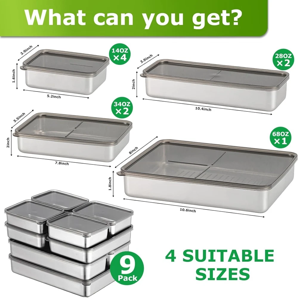 Material Type: Stainless Steel Style: Modern Number of Items in Set: 9 Is The Item Dishwasher Safe?: Yes Item Form: Lidded Rectangular Container Shape: Rectangular Color: Stainless Steel Set Includes: Lid Package Quantity: 1 UPC: Does Not Apply Department: Unisex Adult Product Care Instructions: Dishwasher Safe Features: Dishwasher Safe, Airtight, Hygienic Design, Portable, Reusable Additional Features: Portable, Hygienic Design Item Length: Food Storage Containers Container Shape: Rectangular Item Height: Food Storage Containers Item Volume: 9.76 Liters Item Depth: 1.97 in Closure Type: Latch Material Features: Reusable, Dishwasher Safe, Lead Free, Food Grade Material Type Free: Various Materials Free Material: Stainless Steel Brand: Unbranded Lid Type: Latch Material Feature: Reusable, Dishwasher Safe, Lead Free, Food Grade Capacity: 20.8 pounds Item Width: Food Storage Containers Personalize: No gtin13: Does Not Apply Is The Item Microwaveable?: No