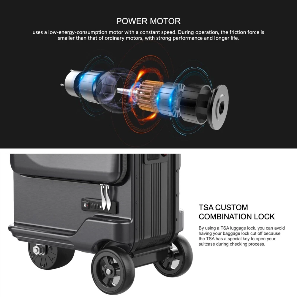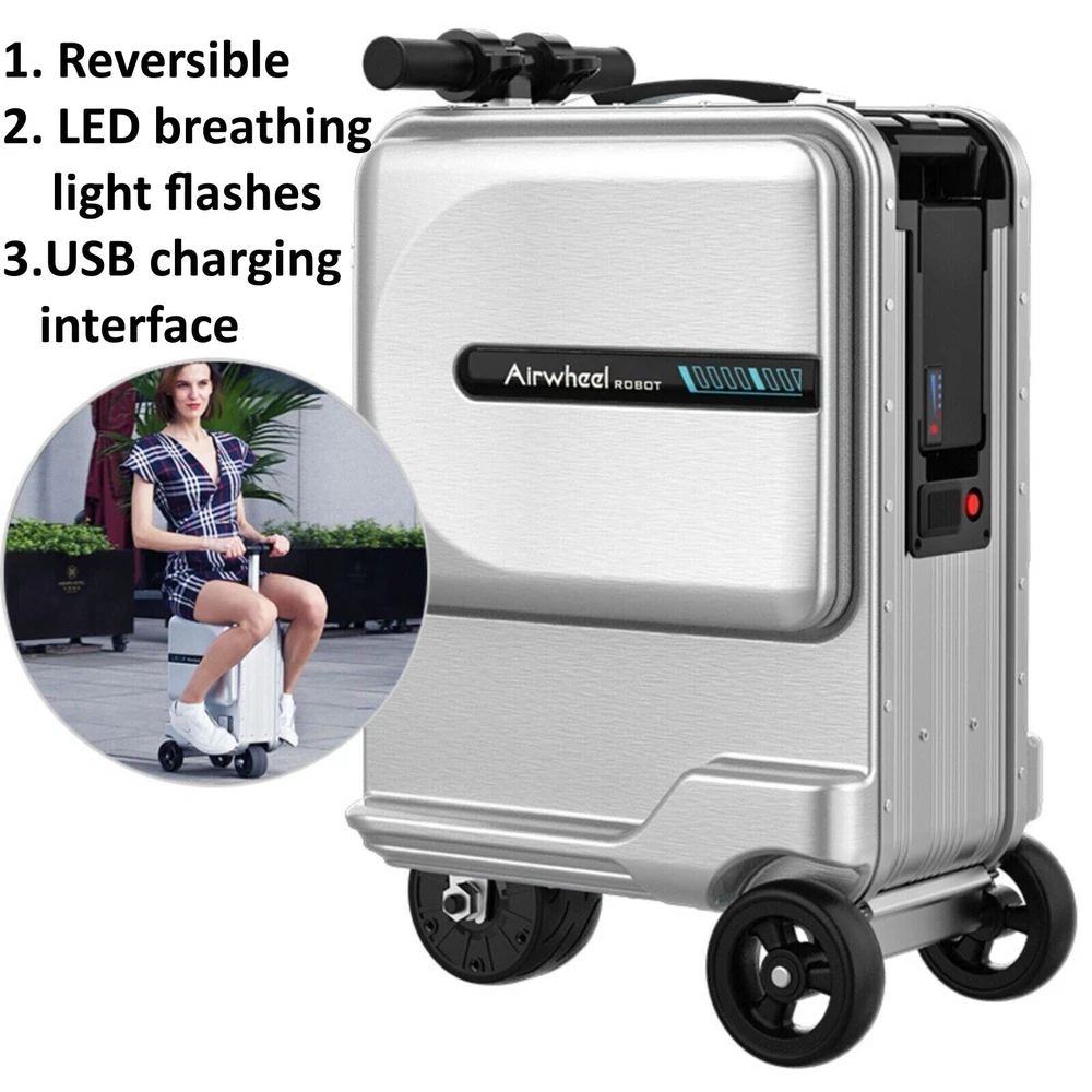 Airwheel SE3MiniT Smart Riding Luggage Suitcase Description: This ingenious multi-purpose suitcase can be a suitcase, a scooter, a mobile seat, or even a toy car! It can be used for your work, sightseeing, for short or long-distance transportation. It truly is a flexible companion that will help you wherever you go. Featuring a patented aluminum support structure, capable of bearing 100 kilograms of weight, and made of a single piece of high-grade aluminum alloy, the Airwheel SE3MiniT will handle your items with ease. It also includes a superior fit between the box shells to guarantee that the box is sturdy and does not bend. Overall, it’s a tough, rugged suitcase with an aesthetically pleasing design. Buyer Note: The difference between mini model and ordinary model: Ordinary models can reverse, LED breathing light flashes, USB charging interface Features: Aviation-grade aluminum alloy frame that’s waterproof and scratch-resistant Can hold up to 100kg in weight, yet it’s lightweight, weighing just 7.5kg Boarding/carry on allowed Includes an intelligent lighting system that lights up the luggage in the dark Switch between suitcase mode and riding mode Powerful motor Smart telescopic handle Removable lithium battery TSA custom lock Features a removable lithium battery You can charge your smart phone, tablet or gaming device using this luggage The SE3MiniT makes use of a motor that has a consistent speed and a low energy usage. During operation, there is less friction than there is in regular motors, which results in superior performance and a longer lifespan. The lithium battery in this luggage piece can be removed and replaced quickly and easily. The rechargeable battery allows for easy packing and satisfies airline carry-on requirements. Specifications: S ize 385 X 250 X 575mm Motor type: Wheel hub motor Pedal height: 152mm Battery type Li-ion Battery Tire size: 4 inch Motor Power: 100W Max loading: 100Kg Battery capacity: 73.26Wh Max. speed: 8km/h Range per charge :8km (loading 70kg, on the flat road) Operating temperature: -10-40°C Max climbing angle: about15° Battery voltage: 37V One year warranty! NOTE: The product parameters are all manually measured, there may be errors, please refer to the actual product received Actual colors may vary slightly due to different device/monitor screen settings subject to reality Import duties and taxes are NOT included in the item price or shipping and are the buyer’s responsibility. Shipment 1. We will send out your orders in one day as soon as we receive your payment. 2. Delivery ways: SpeedPAK, China POST,YANWEN, EMS, USPS,UPS,TNT, DHL etc. 3. Delivery time:10-15 days to USA, 20-30 days to UK, Germany, French, Australia, Canada, etc, Over 30 days to other countries. Return If the item you received is damaged or defective, Please contact us immediately. We will free exchange or refund. We will pay the return shipping costs if the product is defective or the return is a result of our error. If the item is returned for any other reason you are responsible for the return shipping charges. You can return your purchase for up to 15 days from the date of delivery. No refund will be issued if the product shows signs of use. Returned package must be in the original packaging, everything must be in new condition, No missing parts. Our guarantee does not cover accidental damage or wear of product caused by customer. Thank you very much for your understanding! Feedback 100% satisfaction is our aim to pursue. If you have any concerns, please contact us firstly by email. • Please leave me FIVE star POSITIVE feedback if you are satisfied with our items. • Please CONTACT me immediately before leave us neutral feedback or negative feedback, We will provide s olutions and try our to resolve any problems for you. Contact Us Service is our first priority ! If you contact us immediately after placing the order, we will make every effort to assist you with your change request. Unfortunately, we can not make changes or cancel an order once it has been shipped out. Any help, needs or questions, please do not hesitate to contact us. We will quick response within 24 hours from Monday to Friday. Thank you for buying from our store! On May 22, 2025 at 21:59:23 PDT, seller added the following information: