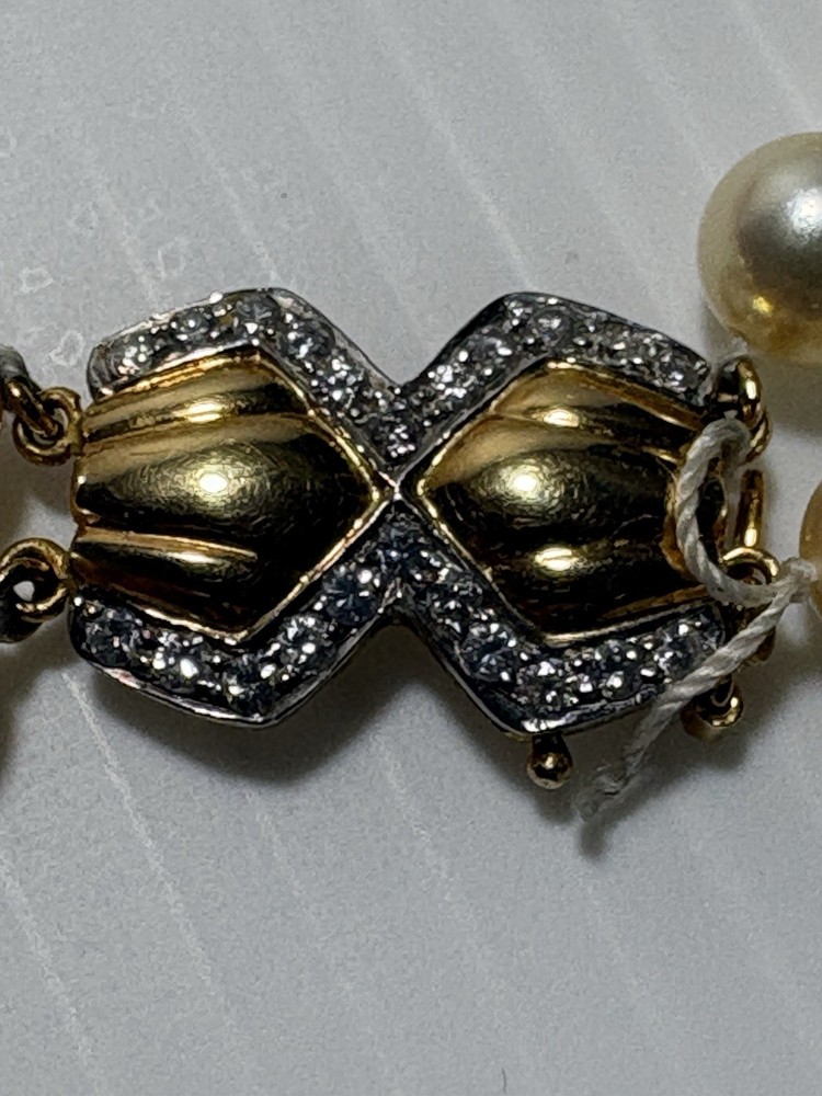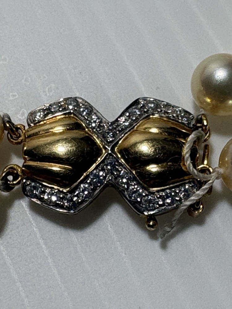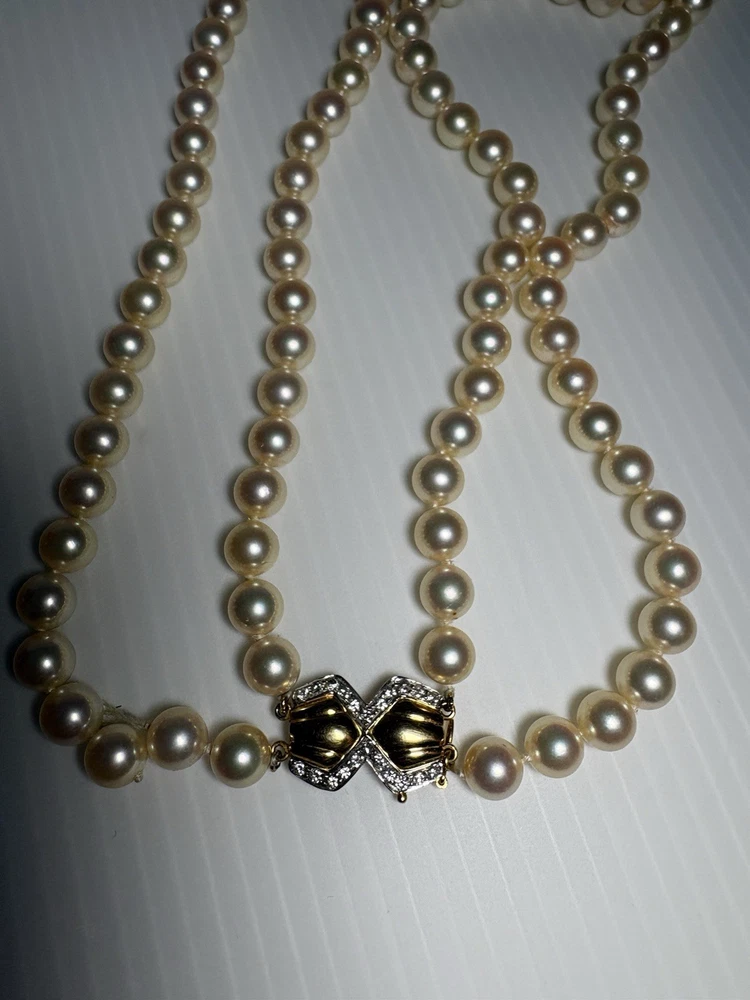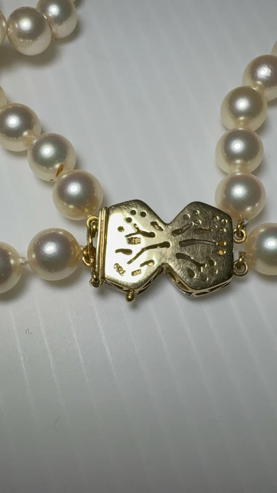 --- ✨ Description Beautiful vintage Akoya pearl double‑strand necklace featuring a luxurious 18K gold (750) clasp accented with diamond‑cut detailing. The clasp is fully hallmarked (750 / AK / 122), confirming authenticity and fine craftsmanship. The pearls are luminous, well‑matched, and gracefully strung in two classic strands, creating an elegant drape that flatters any neckline. This is a timeless piece of fine jewelry—perfect for special occasions, gifting, or adding a refined touch to your collection. Features • Genuine Akoya pearls • Double‑strand design • Solid 18K gold (750) clasp • Hallmarked: 750 / AK / 122 • Diamond‑cut detailing on clasp • Secure vintage box clasp with safety latch • Excellent condition Condition Pearls are bright and lustrous with minimal signs of wear. Clasp is clean, secure, and fully functional. Overall, a beautifully preserved vintage piece , needs to restring again touching it just went off the clasp … Includes Elegant embroidered jewelry pouch for storage or gifting. Any questions pls feel free to contact me