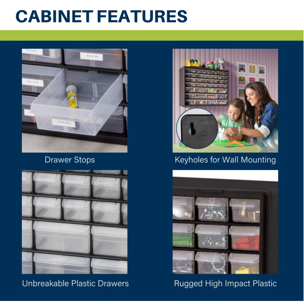* Product details: Versatile storage solutions for school, home, garage or office settings. These rugged plastic cabinets will organize and protect your small parts, toy bricks, office supplies, crafts, beads, hardware, fishing, classroom supplies and more. Cabinet stacks securely and has keyhole slots for hanging on a wall. Flexible, strong, see-through drawers feature finger grip drawer pulls. Large drawer inside dimensions: 4-7/8-Inch x 4-1/4-Inch x 2-Inch; small drawer inside dimensions: 5-1/4-Inch x 1-11/16-Inch x 1-1/2-Inch. Keyholes on back for hanging on walls and tabs on top and bottom for secure stacking. Cabinets have 8 small crosswise dividers and 4 large length dividers included. Included dividers are molded into the back of the cabinet (remove with scissors). * More details: Is Discontinued By Manufacturer ‏ : ‎ No Product Dimensions ‏ : ‎ 15.99 x 19.99 x 6.99 inches; 6.5 Pounds Item model number ‏ : ‎ 10144 Department ‏ : ‎ Office Manufacturer ‏ : ‎ Akro-Mils ASIN ‏ : ‎ B003P2UOCO Country of Origin ‏ : ‎ USA