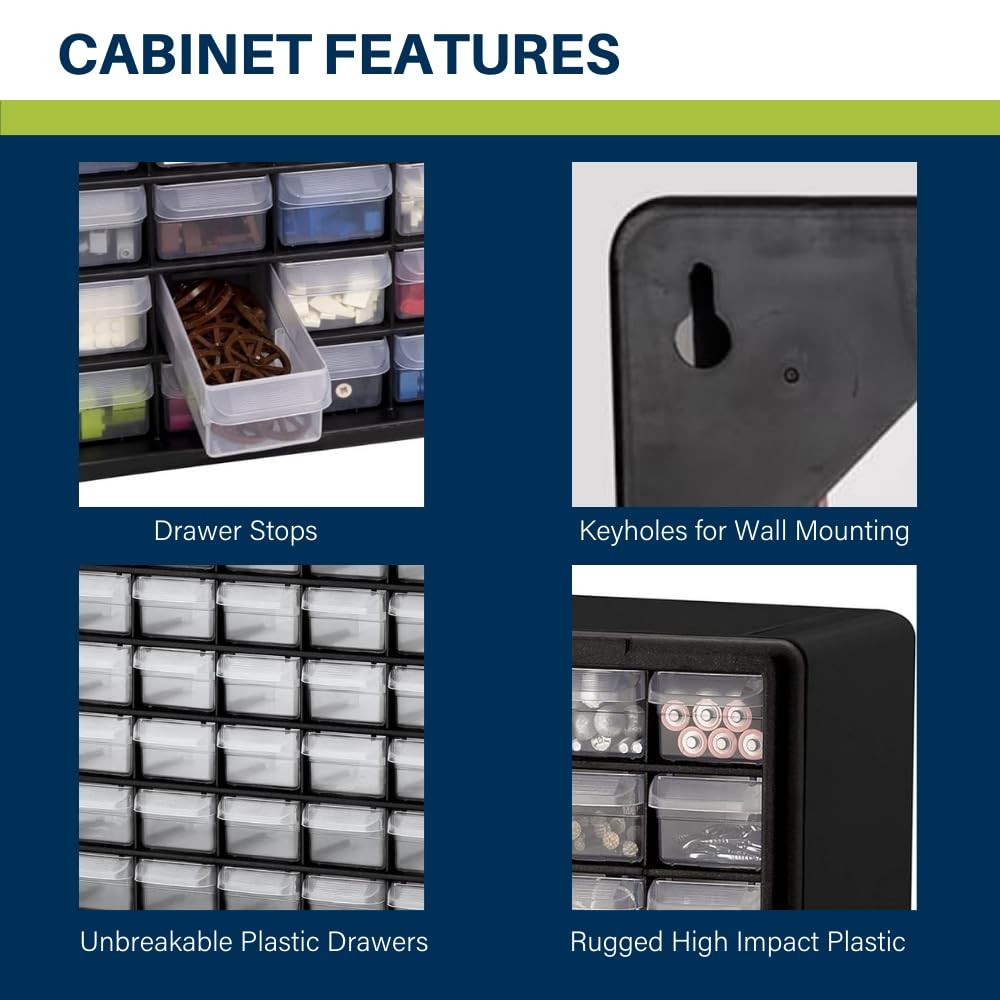 HEAVY DUTY CABINET WITH 64 DRAWERS: The 64-drawer small storage cabinet is made in the U.S.A. from rugged, high-impact plastic and measures 20" W x 6" D x 16" H; Organizer drawers - 6" x 2-1/4" x 1-5/8" GARAGE ORGANIZATION: The small parts organizer is great for garages and workshops for both homeowners and businesses; The plastic storage drawers can be used as tool box, screw organizer or for battery storage; Keep nails and other small parts accessible CLASSROOM ESSENTIALS: Teachers can use the stackable storage drawers for classroom organization; Use it as a teacher toolbox, art supply storage organizer, craft storage cabinet for scrapbook supplies, and more HOME STORAGE AND ORGANIZATION: This plastic storage cabinet offers many uses around the home; It can be a lego storage organizer, craft organizer, or sticker organizer; Use it for makeup storage and organization or for medicine and first aid supplies FEATURES: Stack cabinets securely or use keyhole slots to mount for wall storage; Finger-grip drawer pulls provide easy access; Rear stop tabs prevent contents from spilling; Drawer dividers are included and molded into the back of the cabinet