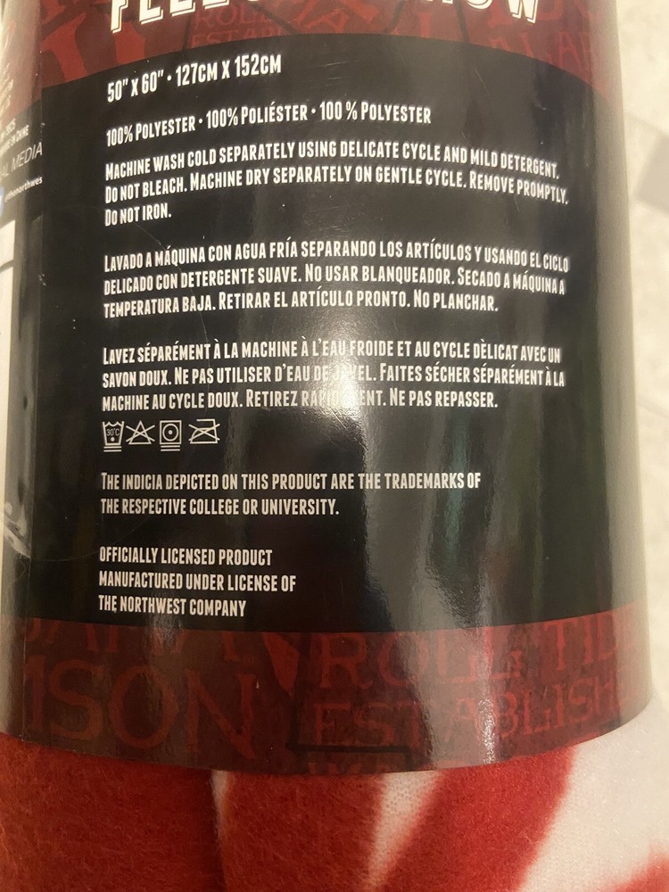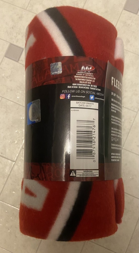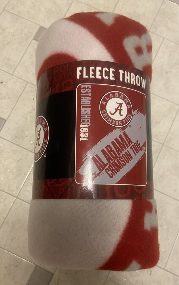 Show your love for the Alabama Crimson Tide with this Northwest NCAA Fleece Throw Blanket. Measuring 50\" x 60\", this painted blanket is the perfect addition to any fan's collection. The blanket features the team's iconic logo and is made of high-quality materials to ensure durability and comfort. Whether you're using it to keep you warm on game day or as a decorative piece in your home, this blanket is a must-have for any Alabama Crimson Tide fan. Brand New rolled fleece blanket.