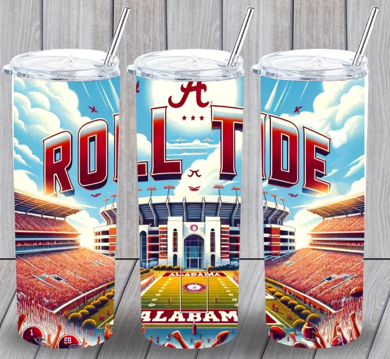 Keeps Hot For: 6 hrs Theme: Alabama Roll Tide Stadium Lid Type: Slide Lock Brand: Handmade Keeps Cold For: 12 hrs Number of Items in Set: Three-Piece Personalize: No Care Instructions: Hand Wash Only Department: Boys, Girls, Kids, Teens, Adults Beverage Type: Hot or Cold Features: With Lid Color: Multicolor Capacity: 20oz Type: Insulated Tumbler Material: Stainless Steel