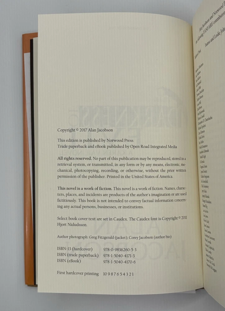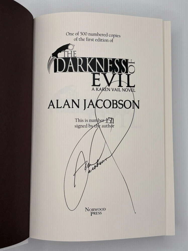 THE DARKNESS OF EVIL [Signed] Author: Jacobson, Alan Title: THE DARKNESS OF EVIL [Signed] Publication: Ellistown, Massachusetts: Norwood Press, 2017 Edition: Limited Edition #171/500 Description: Octavo, 369 pages. In Near Fine condition with Near Fine condition dust jacket. Spine is black with orange and light gray lettering. Dust jacket protected by mylar covering, price uncut: "$35.00" on front flap. Contains printed thank you insert from publisher. Signed flat by Alan Jacobson on publisher's limitation page. Shelved in hallway. Seller ID: 1392276 Subject: Literature Welcome to the eBay store of Second Story Books! DC's Oldest Rare and Used Bookstore, Second Story Books operates two open shops in the Washington D.C. metropolitan area. We have an extensive internet presence and provide accredited appraisals member ASA. This listing was created by Bibliopolis.