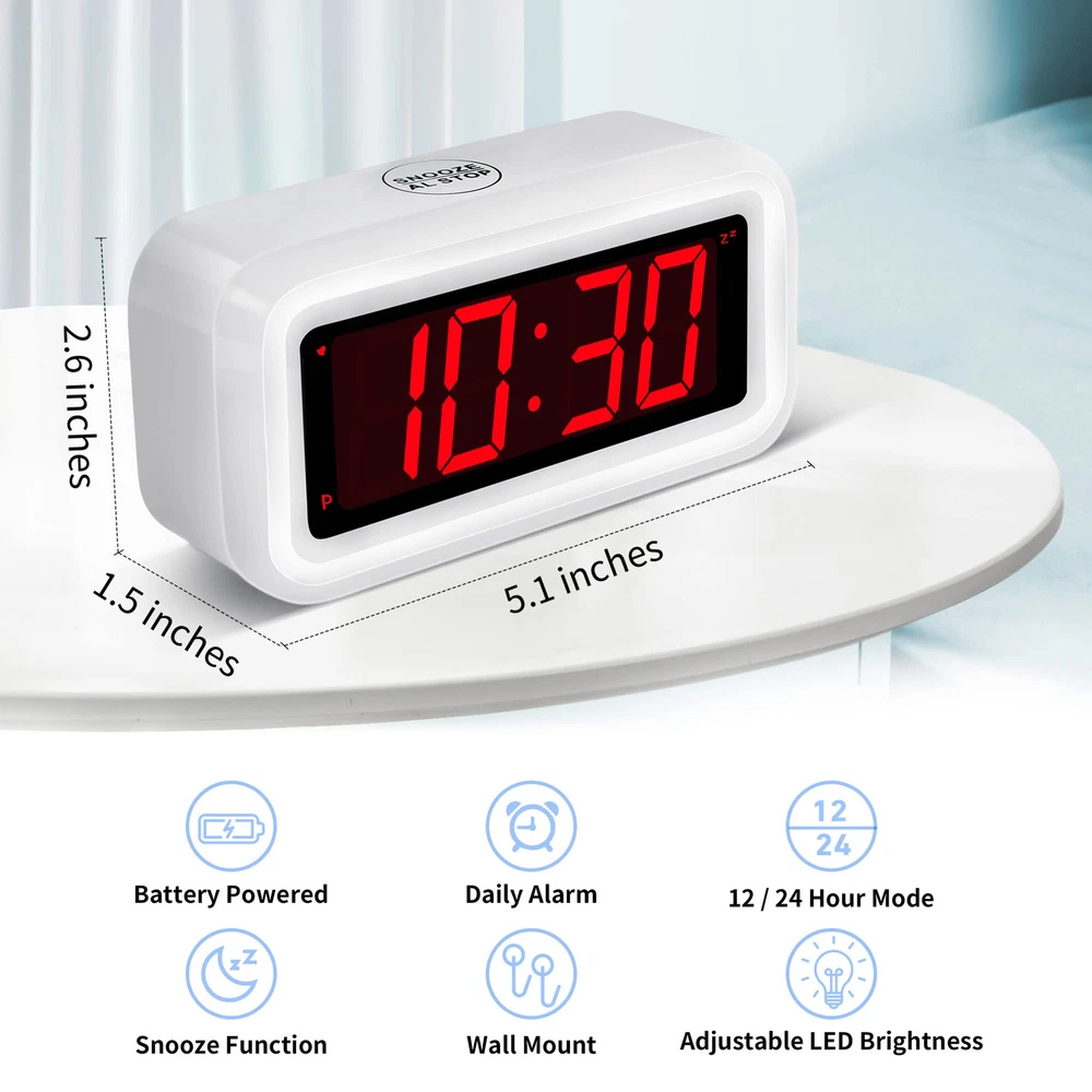Alarm clock & battery operated clock - This basic clock is powered by 4 x AA alkaline batteries only (not included), which can keep Constantly Big 1.2'' LED digit time display for more than 12 months. Bright LED time display, 24hour light up 1.2" large led time numbers can let you check your time clearly from a distance or even in the dark. It is a simple clock. Easy to set - Intuitive and Clear Marked Button, Great alarm clocks for and the elderly, they can operate the clock, set time, alarm, dimmer and 12Hr/ 24Hr. When the alarm is beeping, simply touch the top big snooze to pause the alarm to get extra 7 minutes nap, press any button to stop alarm today, and it will still sound the next day. Press “AL ON/OFF” to cancel the alarms and the alarm icon on the top-right corner will disappear. Alarm clock for bedroom - There are 3 levels of brightness for your options (day time), high/middle/low. The clock will enter into Night-mode and dim automatically at 8:00pm~6:00am to protect your eyes at night and save energy. No blinding lights or any annoying sounds disturb your sleep, create an peaceful environment for sleep. Perfect alarm clock for bedroom, beside, nightstand, desk, shelf and table. Digital alarm clock - Alarm clock will continue for 90 seconds ensuring definitely waking up. The alarm bell will louder every 30 seconds. There is also a 7-minute snooze that can be continually pressed repeat 3 times. The time accuracy of this clock is less than +/-30s per month. Small wall clock & desk clock - 1 holes on the back for easy wall-mounting for a small wall clock. It is also table-top for a simple desk clock. Perfect gifts for , toddlers, teens, adult, seniors, elderly, boys or girls, friends or families, ideal for gifts alarm clock.