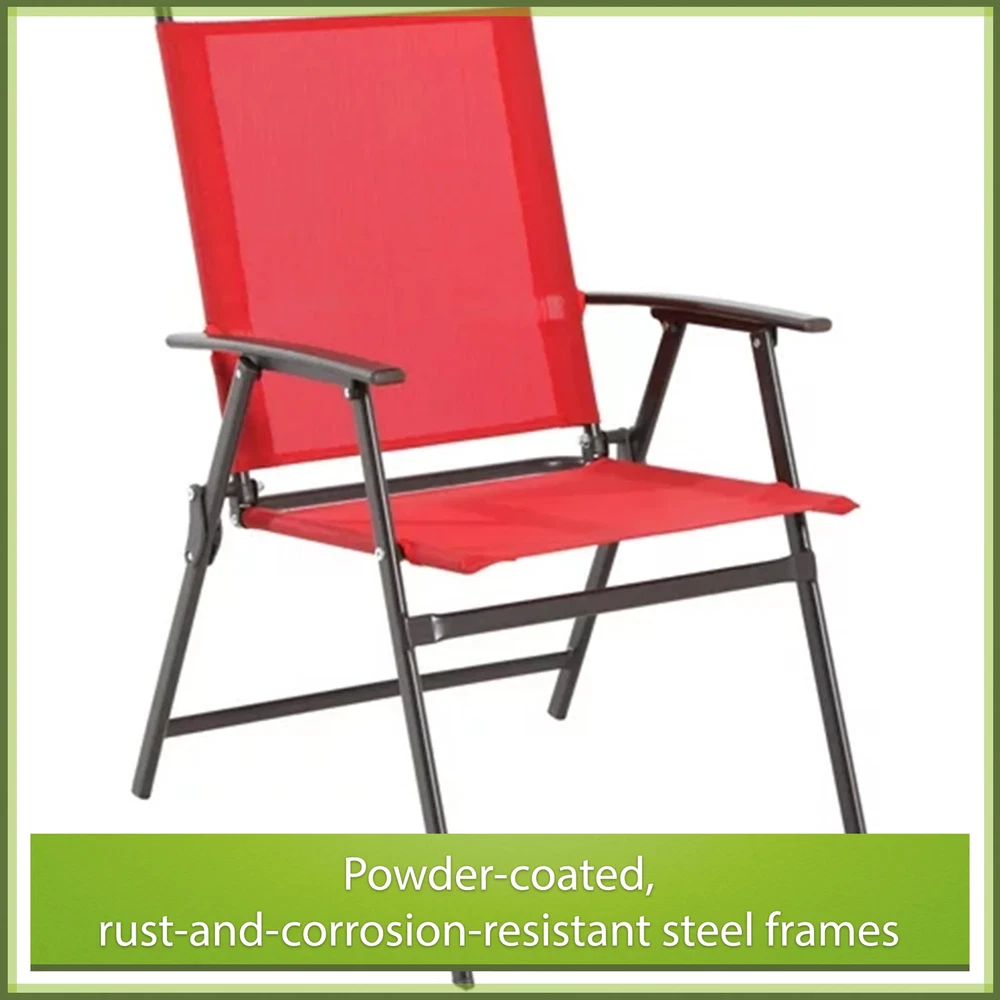 Entertain friends and family with the Mainstays Albany Lane 6-Piece Outdoor Patio Dining Set. This casual set includes 4 foldable armchairs, a square table with a tempered glass top and umbrella hole, and a stylish market umbrella. The chairs and umbrella feature red sling fabric for quick-drying, and the black frames are made of rust-resistant steel. The all-season set complements any outdoor decor and is easy to assemble. With its quality craftsmanship and traditional style, the Albany Lane set is the perfect addition to your patio, porch, or deck. Mainstays Albany Lane 6-Piece Outdoor Patio Dining Set, Red Casual, outdoor patio set ideal for entertaining, dining, and relaxing Includes 4 foldable, portable, easy-to-store armchairs, a square table with a water-wave, tempered glass top, and a stylish market umbrella Chairs and umbrella feature quick-drying sling fabric; black frames constructed of powder-coated, rust-and-corrosion-resistant steel Stylish, classic look complements most other outdoor furniture and decor Quaint, fun little addition to any porch, patio, or deck Instructions included for easy assembly Materials: Steel, tempered glass, PVC sling, polyester Weight capacity: 250 lbs (each chair) Assembled dimensions: 24.8"L x 22.44"W x 35.83"H (each chair), 33.8"L x 33.8"W x 27.5"H (table), 59.06"L x 59.06"W x 86.61"H (umbrella) Weight: 8.91 lbs (each chair), 28.22 lbs (table), 6.31 lbs (umbrella) Total weight: 70.17 lbs Care: Clean with mild solution of soap/detergent, rinse thoroughly, allow to air dry; do not use bleach or strong solvents as this will cause damage to both fabric and metal finishes