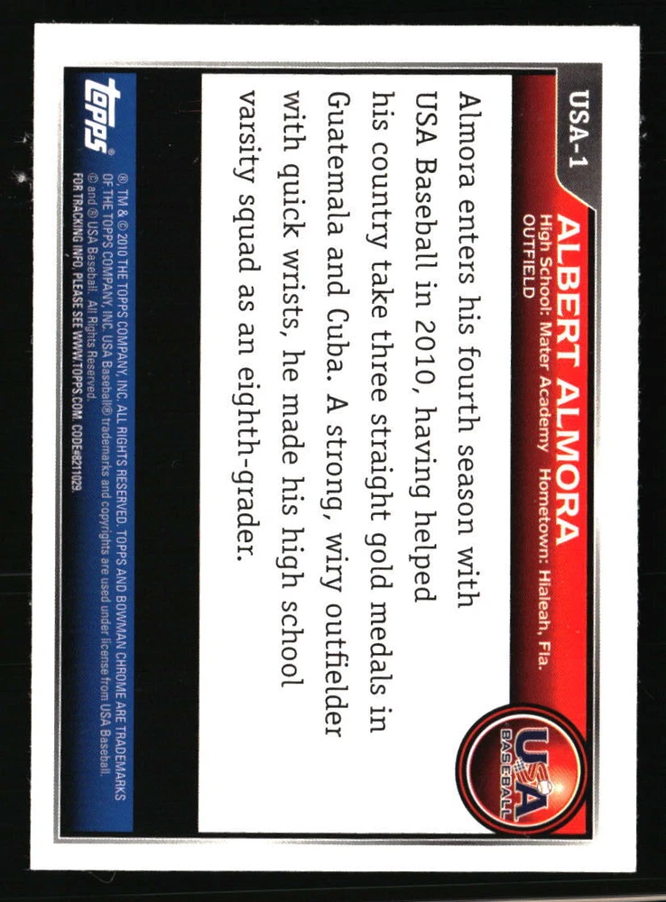 Sport: Baseball Parallel/Variety: USA Stars Team: USA Set: Bowman Chrome Year Manufactured: 2010 Autographed: No League: MLB Manufacturer: Bowman Chrome Type: Sports Trading Card Player/Athlete: Albert Almora Card Number: USA-1 Graded: No Season: 2010