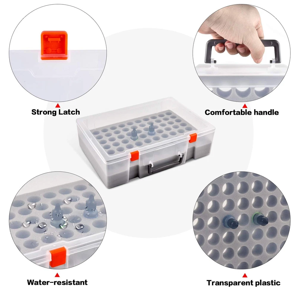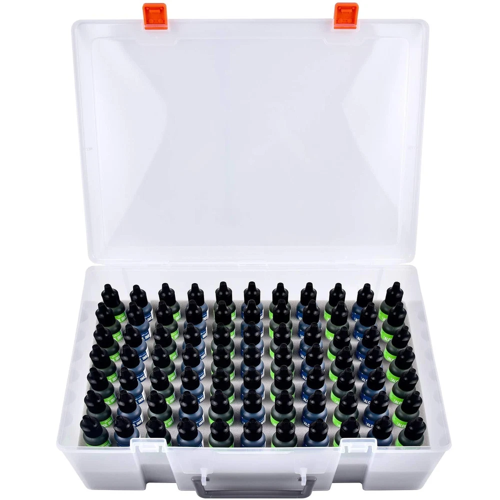 Large alcohol Ink and paints case -Holds 77 Bottles: Fits bottles up to 1 inch wide and 3 inch tall. Keep your alcohol ink collection organized and easily accessible with our large capacity storage case - holds up to 77 bottles, including many brands fits the size (No Any Bottles Included) Strong and heavy-duty plastic material: White alcohol ink case made of good material plastic, more resistant and crash worthiness than acrylic. Clear enough to find what colors you need. Easy for resin petri dish making, for epoxy resin painting, for tumbler cup making Great Construction Art Storage Organizer: Unique insert Foam with nice slot cut, fits for army painter bottles, for vallejo game colors bottles, for reaper paint bottles, for GSW paint dropper bottles, fits the alcohol ink snugly, also can tightly fix all alcohol ink in the groove, avoid the friction between each other, will not spill out due to shaking, keeping your home clean and tidy Alcohol Ink Bottle Storage Container: Stand-up foam design allows you easy to put your paint dropper bottles in and out of the case, make the bottles more stable, keeps the colors from getting spilled and fall over. Strong double latch for easy to open and close Alcohol Ink Carrying Case for travel: lightweight and portable size:14*10.5*3.8inches. Our alcohol ink carrying case is perfect for taking your miniatures and getting together with friends to paint. The strong top handle makes it easy to transport your alcohol ink set wherever you go