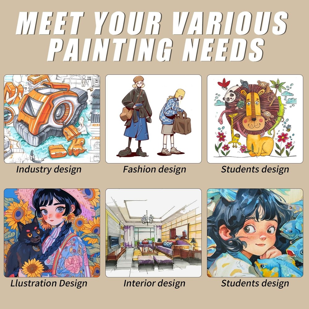 Drawing marker pens are essential for any artist's toolkit. This set of 12 vibrant markers allows for rich, bold coloring without the mess. With a wide variety of colors from crimson red to emerald green, you'll be inspired to bring your drawings and illustrations to life. The broad tips lay down color smoothly and allow for blending and shading. At the same time, the markers are precise enough for fine details. And with their alcohol-based ink that dries quickly, you can layer color without smearing. An affordable, portable set, these markers are perfect for coloring on the go or adding highlights to your work. 【HIGH-QUALITY MARKER SET】The product includes 80 high-quality alcohol markers in various colors. The ink is smooth and even, resistant to smudging and fading, and offers professional accuracy. It's easy to use and well-received by both adults and children. 【VIBRANT COLORS】With 80 unique colors, these alcohol markers bring your artwork to life. They are versatile, providing all the essential primary and secondary hues for artists in painting, sketching, illustration, design, comics, letters, posters, and animation. 【TWO PENS IN ONE】This dual-ended marker features two different tip sizes, allowing for versatile writing and drawing. 【CONVENIENT DESIGN】This marker is designed for comfortable grip during writing, with a colored cap for easy identification. The soft rectangular body features a roll-free design, ensuring stability during use while providing a great writing experience. 【CAUTIONS】This marker is non-toxic and acid-free, making it safe for children and students. To prevent ink leakage, avoid leaving the tip on paper for too long. After use, always cap it and store it horizontally to prevent drying and leakage.