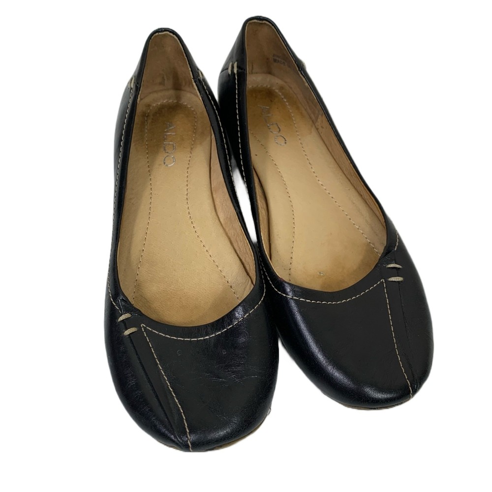 Aldo Women’s Black Rounded Toe Flats - Size 6.5 (37) Minor signs of normal wear. Overall in excellent preowned condition! Rounded toe black flats with off-white, gold stitching detail. 2P25 64-4251 11 oz Tags: romantic, balletcore, career, dainty