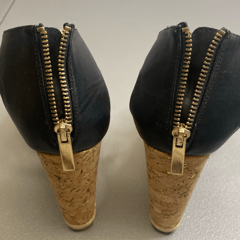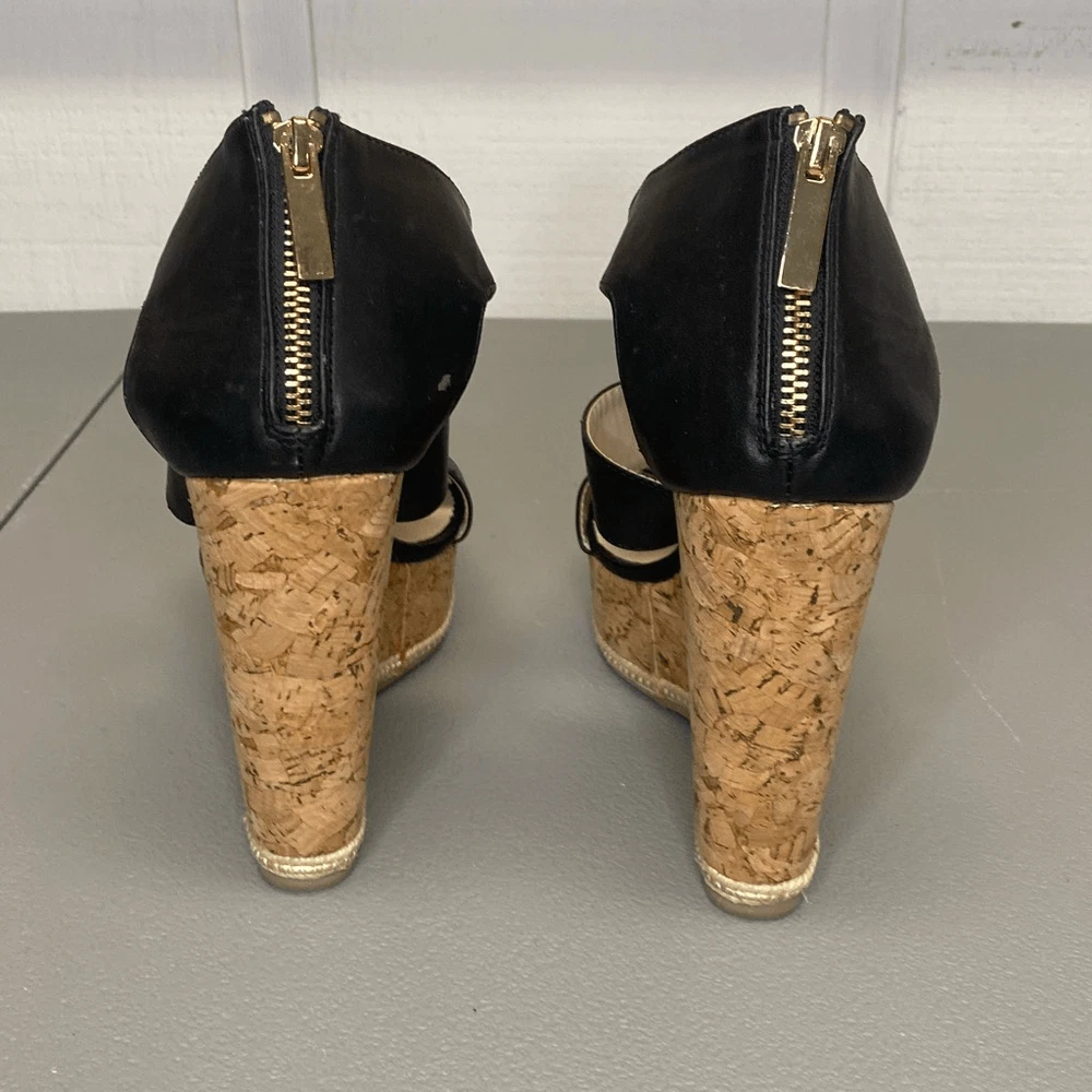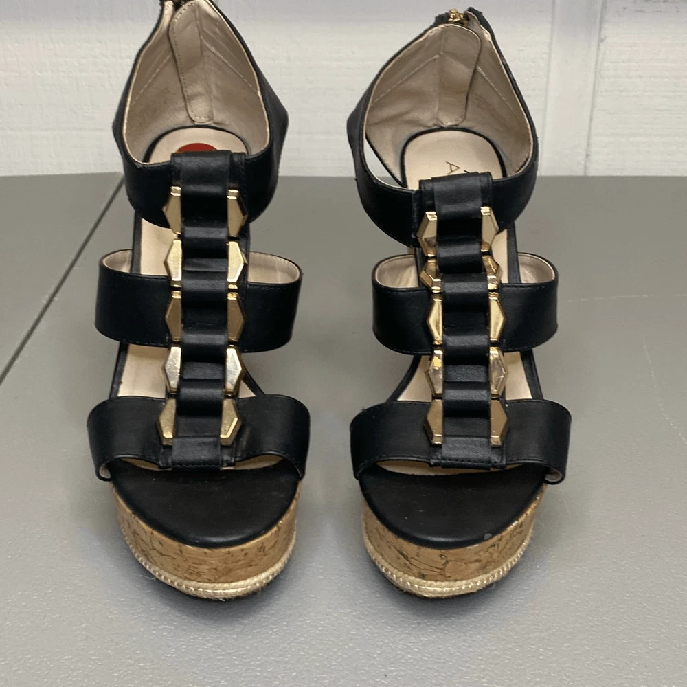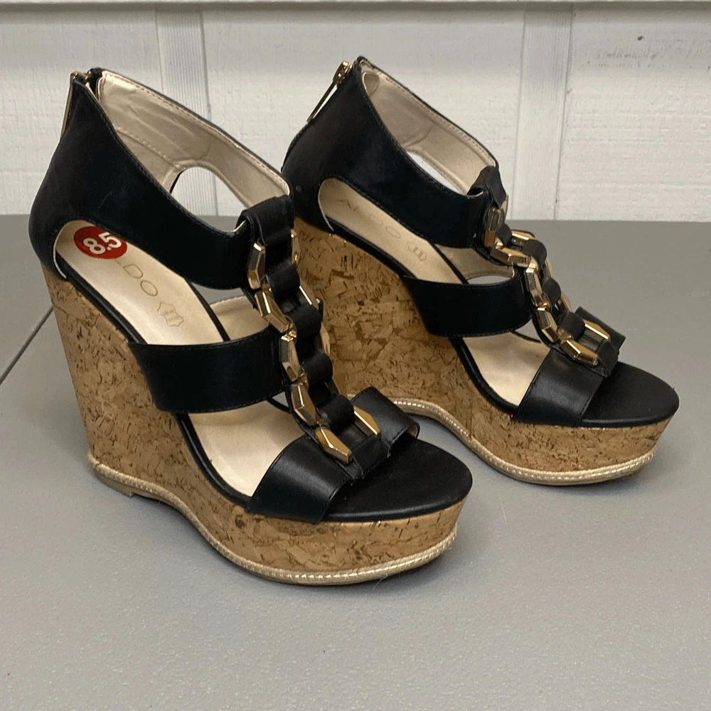 NEW Sexy Aldo Wedge Platform Strappy Sandal Cork Leather Black Gold Sz 8.5 Pair of NEW unworn wedge sandals. Old stock, some minor scuffs. Please see pictures. The platform at the front of shoe is approx 2” high. The back heel from floor to insole is approx 5.25”. Zipper feature in back at heel, zippers work.