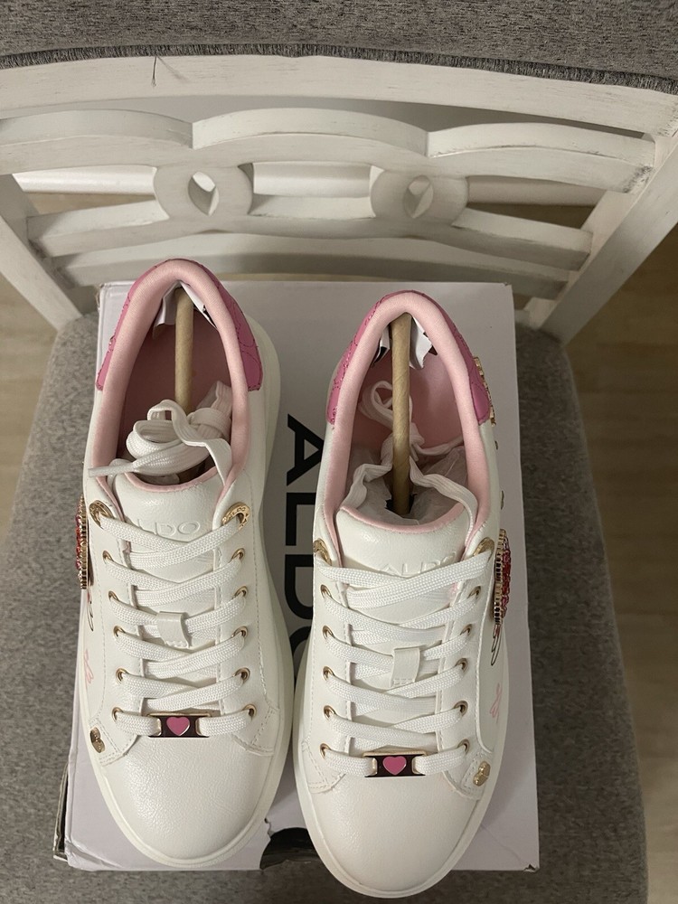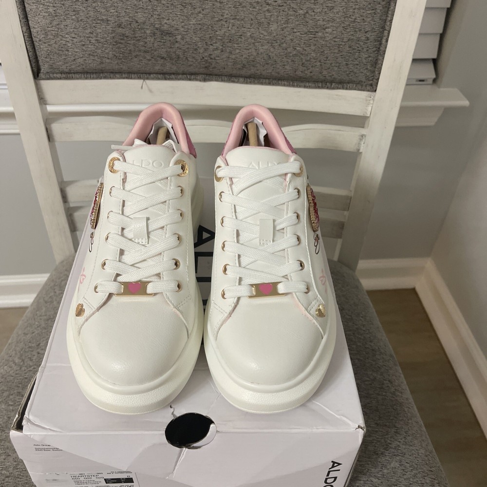Step into a blend of comfort and style with the Also Heartstep Pink Women's Low Top Sneakers. These sneakers are a perfect addition to your casual footwear collection, featuring a vibrant pink hue that adds a pop of color to any outfit. The renowned Aldo brand ensures quality and a sleek design, while the athletic style provides both versatility and ease of movement. Crafted for the fashion-forward woman, these sneakers come in a US size 6.5 and a UK size 4, fitting seamlessly into your day-to-day activities. Whether you're running errands or meeting friends, the durable construction and supportive fit offer both practicality and a chic aesthetic. Elevate your sneaker game with these stylish, new-with-box kicks.
